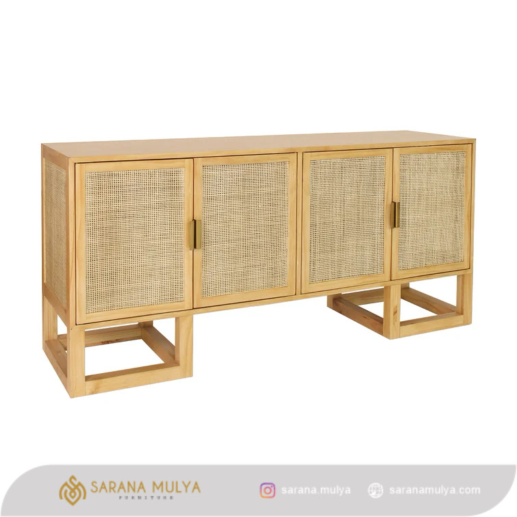Lengkapi ruang tamu maupun ruang keluarga Anda dengan Bufet Minimalis Kayu Jati Anyaman Rotan. Selain berfungsi untuk menyimpan berbagai barang kesayangan Anda, lemari bufet ini juga bisa dimanfaatkan untuk memajang berbagai hiasan seperti tanaman artifisial maupun bingkai foto yang dapat mempercantik hunian. Bufet minimalis ini menyediakan dari 4 buah pintu penyimpanan dengan 2 rak di dalamnya. Terbuat dari material kayu jati solid pilihan yang berkualitas kombinasi anyaman rotan alami dengan struktur yang kuat dan kokoh, menjadikan lemari bufet minimalis ini tahan lama untuk digunakan.