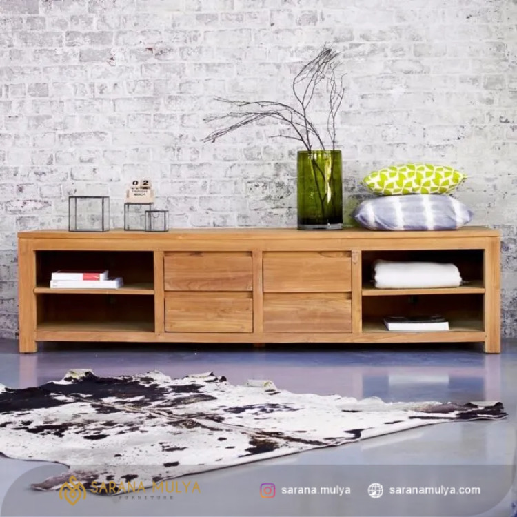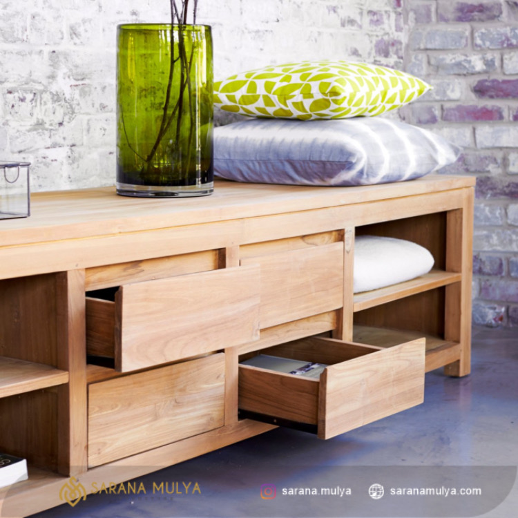 Bufet Minimalis Modern Natural Kayu Jati adalah pilihan terbaik furnitur serbaguna untuk tempat penyimpanan dan tempat menaruh barang-barang Anda. Dengan desain minimalis modern, bufet minimalis ini dilengkapi 4 rak terbuka dan juga 4 laci penyimpanan berbagai kebutuhan Anda. Selain itu, bagian permukaan kabinet dapat di gunakan untuk menaruh berbagai barang seperti pajangan kesayangan Anda. Terbuat dari material kayu jati solid pilihan yang berkualitas dengan kontruksi yang kuat dan kokoh, keawetan bufet minimalis ini tidak usah diragukan lagi. Hasil akhir finishing doff yang halus dan mudah untuk dibersihkan.