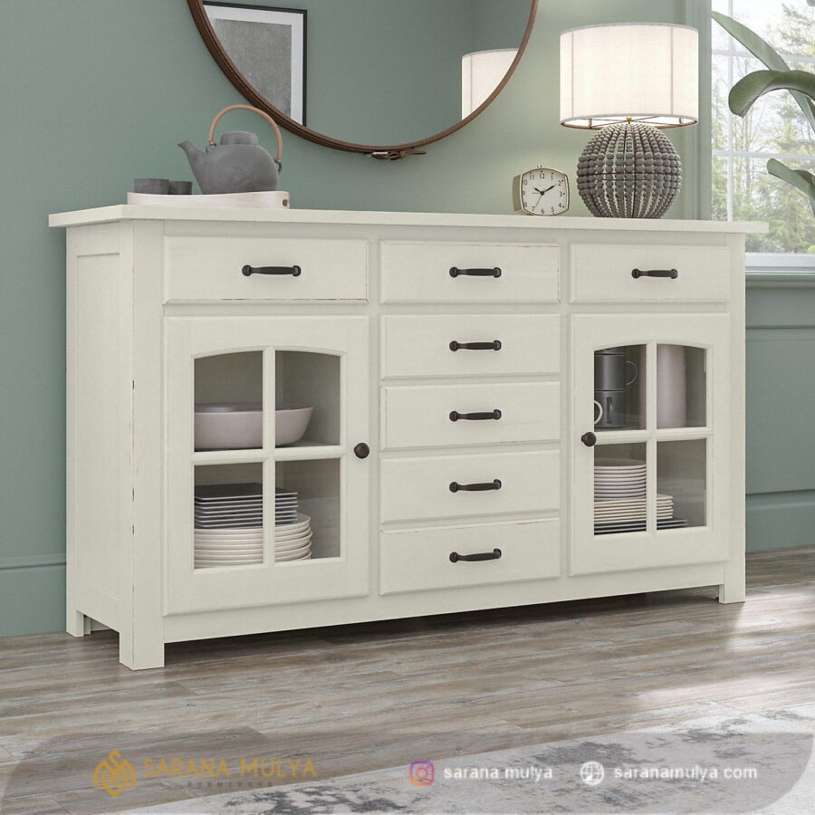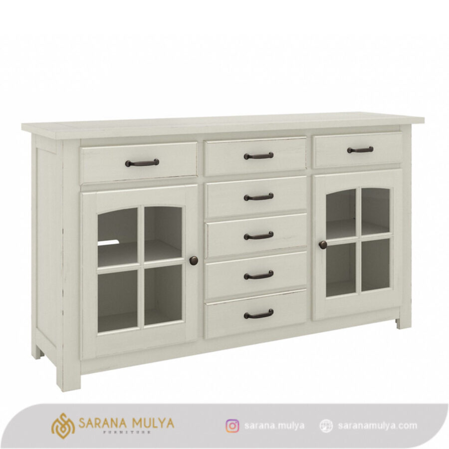 Bufet Minimalis Putih Duco Kayu Solid bisa menjadi pilihan terbaik Anda yang sedang mencari furnitur minimalis yang awet dan tahan dalam segala kondisi. Bufet kayu minimalis ini didesain dengan model yang fungsional, ditambah dengan material terbaik. Terdapat 7 laci dan 2 pintu penyimpanan dengan rak di dalamnya untuk menyimpan berbagai barang kesayangan Anda. Anda juga bisa memajang hiasan di permukaan bufet minimalis ini seperti tanaman artifisial maupun bingkai foto untuk mempercantik hunian. Terbuat dari material kayu mahoni solid pilihan yang berkualitas dengan struktur rangka yang kuat dan kokoh, menjadikan bufet minimalis ini tahan lama untuk digunakan dalam waktu yang panjang.