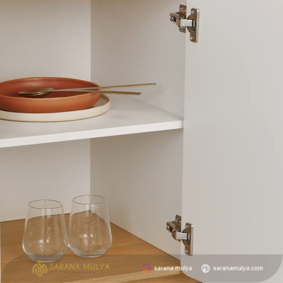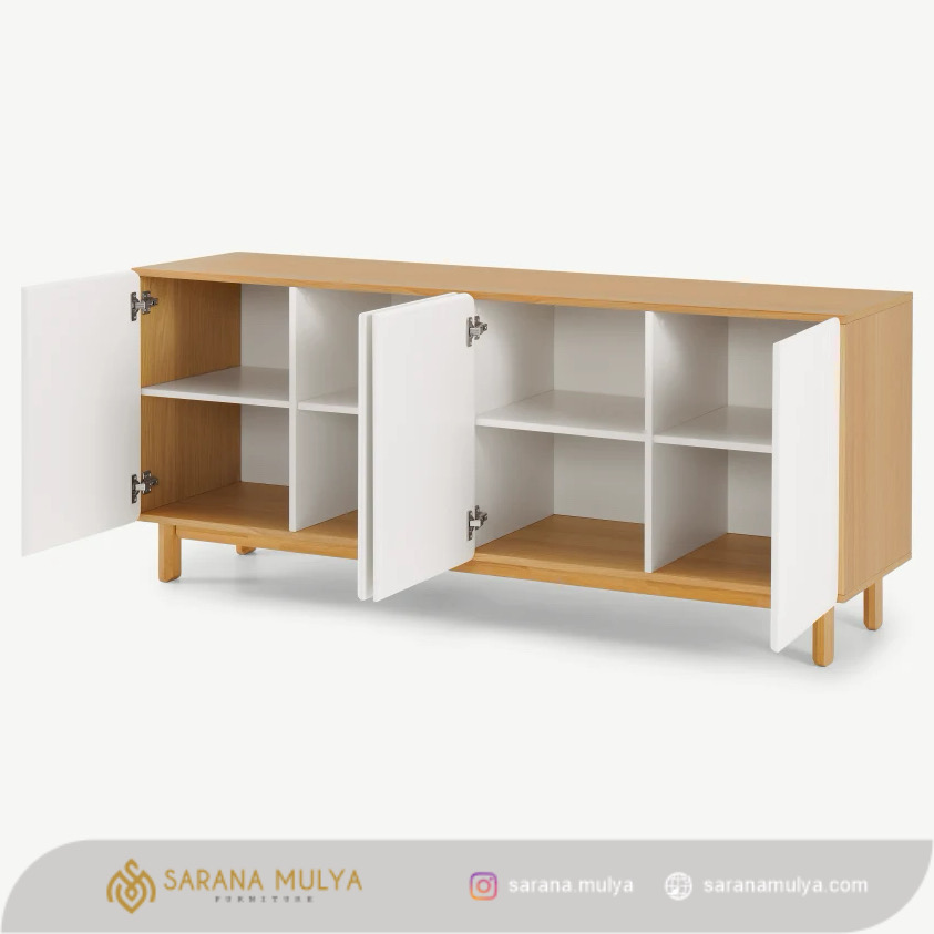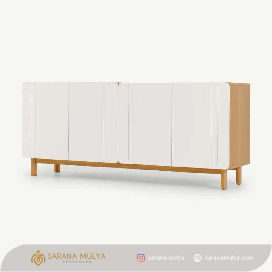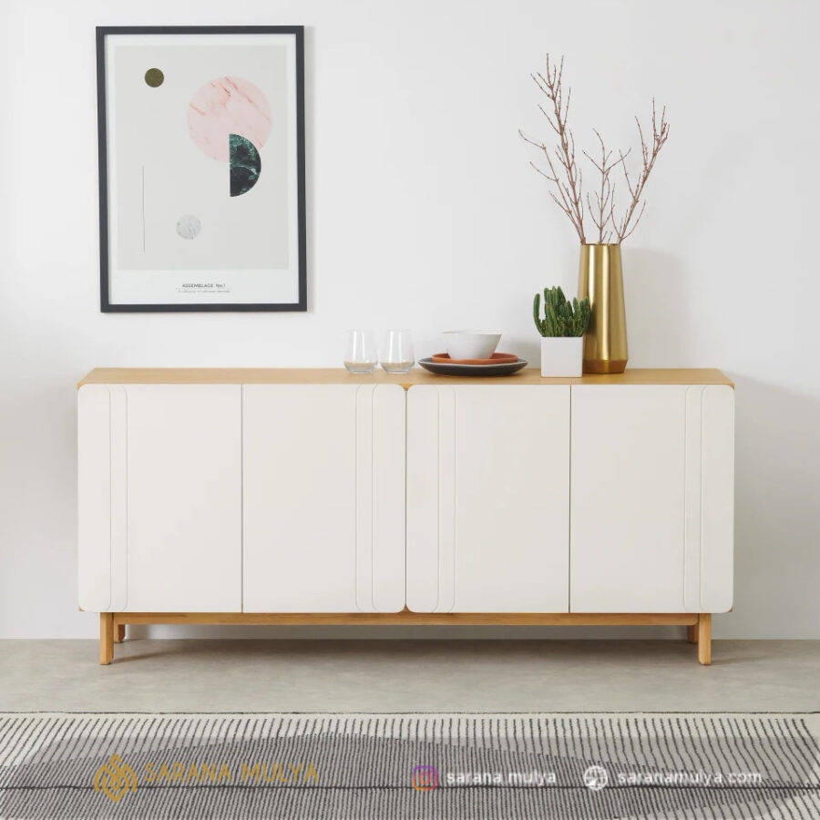 Organisir tata ruangan ruang tamu maupun ruang keluarga Anda dengan Bufet Minimalis Terbaru Kayu Solid. Hadir dengan desain minimalis modern dengan kombinasi warna natural dan putih. Bufet minimalis ini menyediakan 4 pintu penyimpanan yang dapat Anda gunakan untuk menyimpan barang. kesayangan Anda. Selain itu, bagian permukaan bufet minimalis ini bisa Anda letakkan hiasan seperti tanaman artifisial maupun bingkai foto untuk mempercantik hunian. Terbuat dari material kayu jati solid kombinasi kayu mahoni pilihan yang berkualitas dengan kontruksi yang kuat, kokoh dan tentunya tahan lama. Hasil akhir finishing doff yang membuat kesan elegan di ruangan Anda.