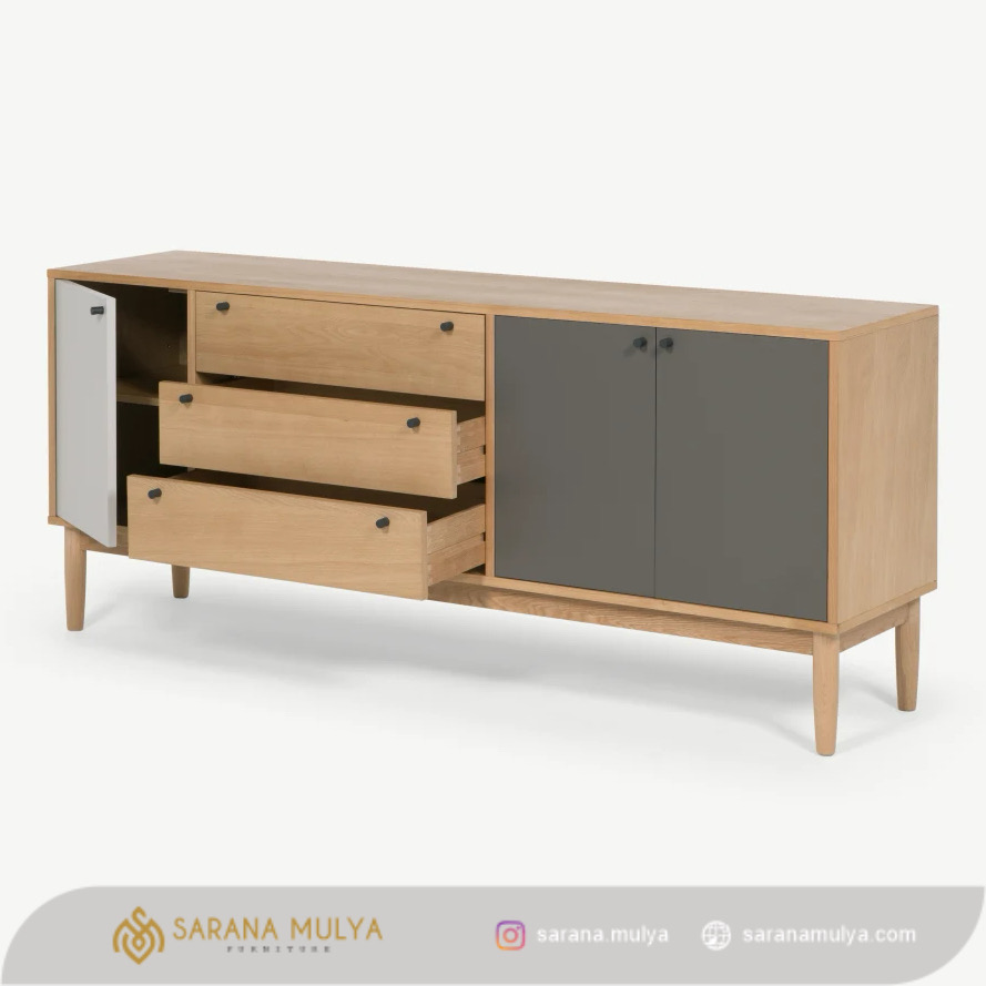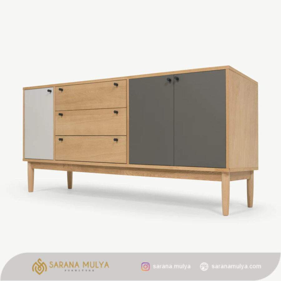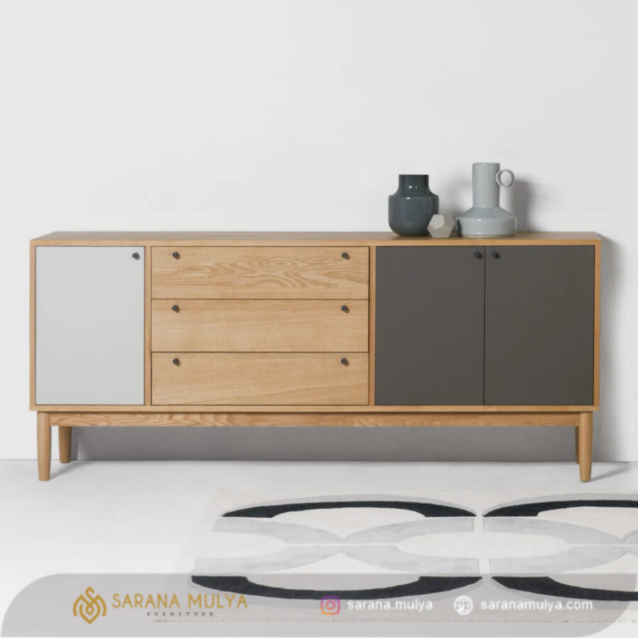 Maksimalkan fungsi ruang tamu maupun ruang keluarga Anda dengan menghadirkan Bufet Retro Kayu Minimalis Masakini. Dengan desain minimalis modern, bufet minimalis ini dilengkapi 3 pintu dan juga 3 laci penyimpanan yang dapat dimanfaatkan untuk menyimpan serta mengatur letak barang sehingga penampilan ruangan dapat menjadi lebih rapi dan juga tertata. Anda juga bisa memajang hiasan di permukaan bufet minimalis ini seperti tanaman artifisial maupun bingkai foto untuk mempercantik hunian. Terbuat dari material kayu jati kombinasi kayu mahoni pilihan yang berkualitas dengan kontruksi yang kuat, kokoh dan tentunya tahan lama. Hasil akhir finishing doff yang halus dan mudah untuk dibersihkan.