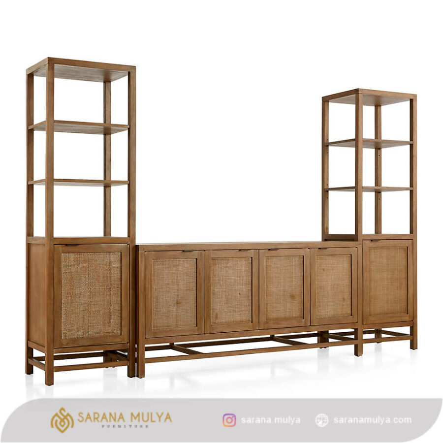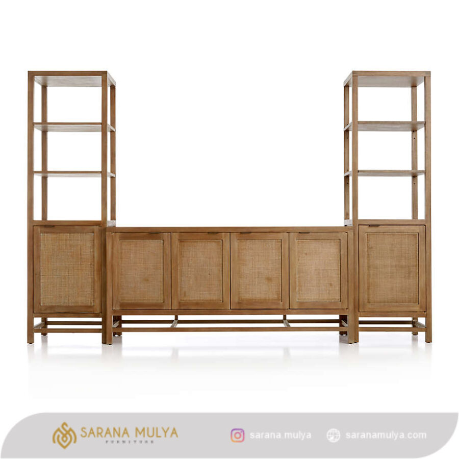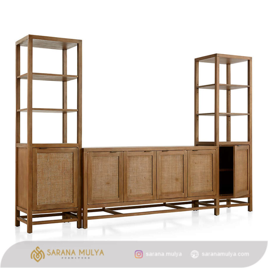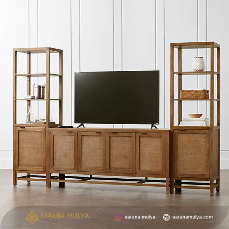 Ruang tamu atau ruang keluarga sering kali membutuhkan perhatian ekstra dalam pengisian furnitur. Tidak hanya indah dipandang mata, furnitur juga harus memiliki fungsi penyimpanan yang maksimal. Seperti Bufet Tv Minimalis Rotan Kayu Jati ini untuk tempat menaruh berbagai perlengkapan hiburan mulai dari televisi, DVD player, game konsol, koleksi buku hingga pajangan. Bufet Tv ini menyediakan sejumlah laci, rak terbuka dan pintu swing untuk menyimpan barang agar tertata rapi. Bermaterial kayu jati solid berkualitas kombinasi anyaman rotan alami dengan rangka yang kuat dan kokoh. Hadir dengan nuansa natural yang membawa kesan hangat di ruangan. Bufet Tv Minimalis Rotan Kayu Jati cocok untuk menemani momen berkumpul bersama keluarga menjadi lebih menyenangkan.