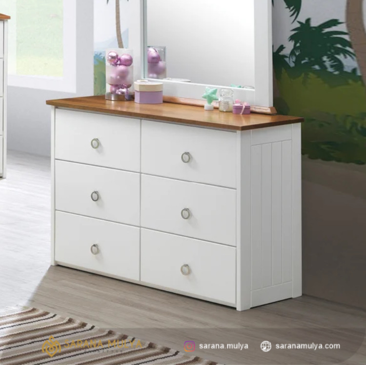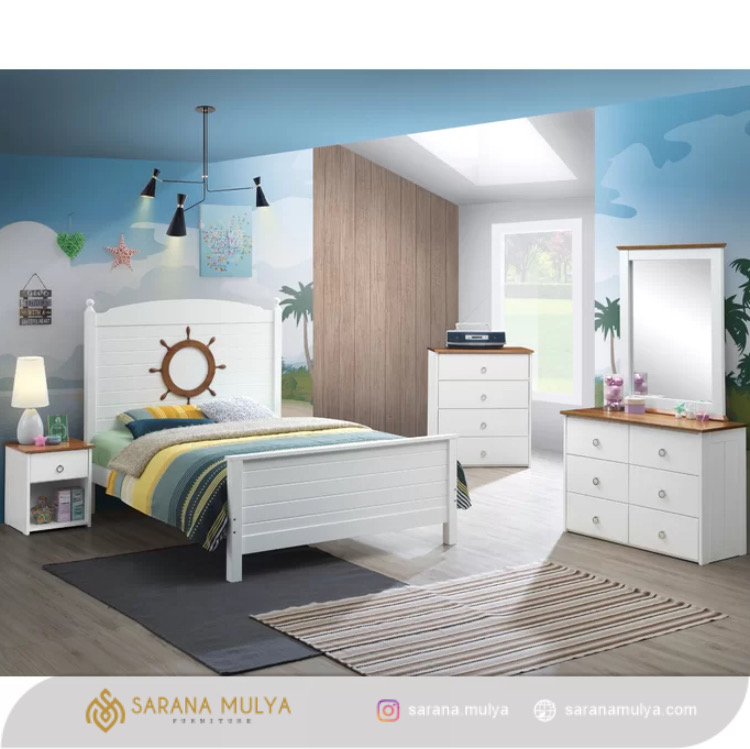 Kamar Set Anak Minimalis Terbaru dengan konsep modern akan memudahkan Anda untuk mengisi kamar tidur dengan sentuhan furnitur yang senada, Set kamar tidur ini terbuat dari material kayu mahoni kombinasi kayu jati solid kualitas tinggi yang kokoh dan tahan lama, Terdiri dari tempat tidur, nakas, meja rias dan lemari pakaian dengan warna kombinasi putih dan walnut, Memiliki finishing semi glossy yang menghadirkan sentuhan cantik di ruang tidur anak.