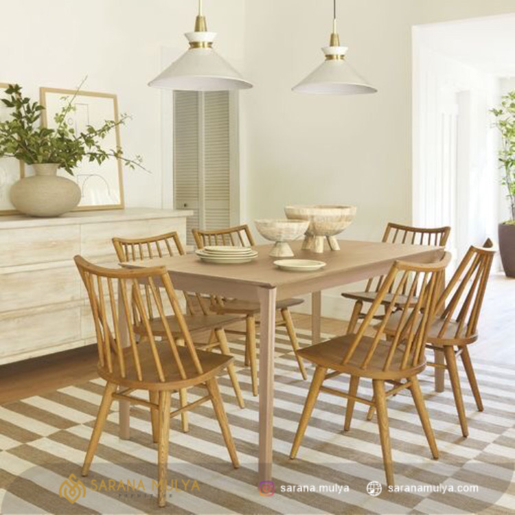 Waktu makan menjadi salah satu momen berkumpul bagi keluarga. Jadikan momen di ruang makan tersebut lebih menyenangkan dan nyaman dengan Kursi Makan Natural Jari Jari Minimalis. Hadir dengan desain minimalis modern yang unik dengan nuansa warna natural. Kursi makan ini terbuat dari material kayu jati solid berkualitas dengan finihing semi glossy yang halus, membuatnya lebih kokoh dan tidak mudah rusak. Selain dapat terasa nyaman saat digunakan, kursi makan kayu ini cocok di kombinasikan dengan Meja Makan bergaya ruangan bertema modern minimalis, klasik maupun scandinavian.