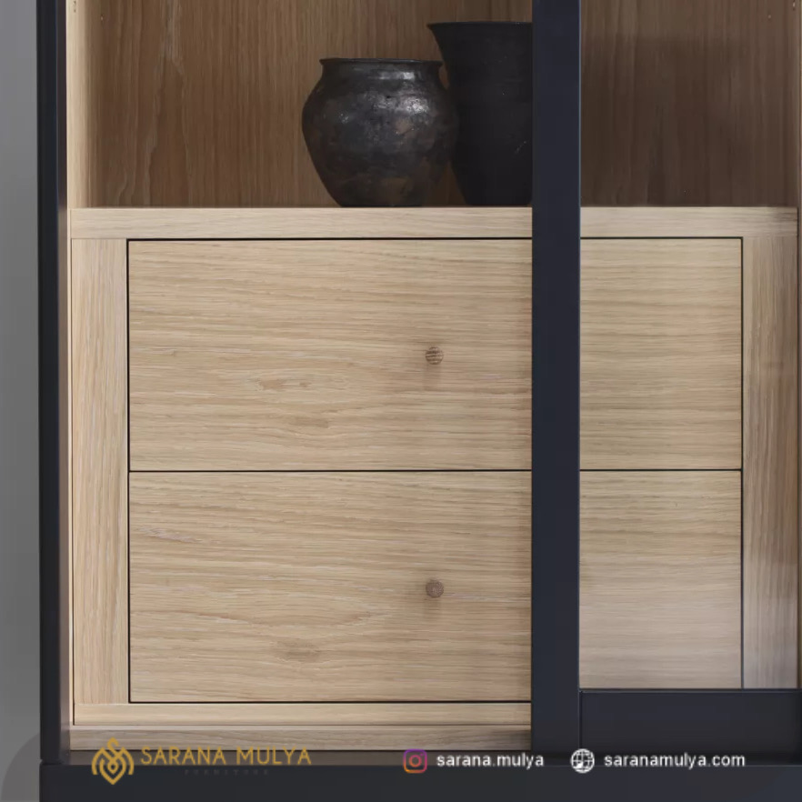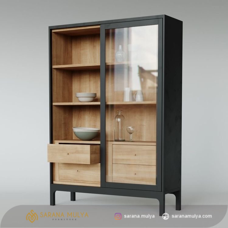 Untuk menyimpan aneka koleksi pajangan Anda agar tertata rapi, Lemari Hias Laci Pintu Sliding Minimalis persembahan dari saranamulya.com ini adalah pilihan yang tepat bagi Anda. Dengan desain minimalis modern, serta dilengkapi dengan laci penyimpanan, 3 tingkat rak dan pintu sliding kaca yang memudahkan Anda untuk melihat isi di dalamnya. Lemari pajangan ini hadir dengan material kayu jati solid berkualitas dengan rancangan rangka yang kuat menjadikan Lemari hias ini dapat berdiri dengan stabil, kokoh dan tentunya tahan lama. Hasil akhir finishing doff dengan warna hitam, natural yang akan menambah kehangatan di ruangan Anda. Lemari pajangan ini sangat cocok untuk Anda tempatkan di ruang tamu, ruang keluarga maupun kantor Anda.