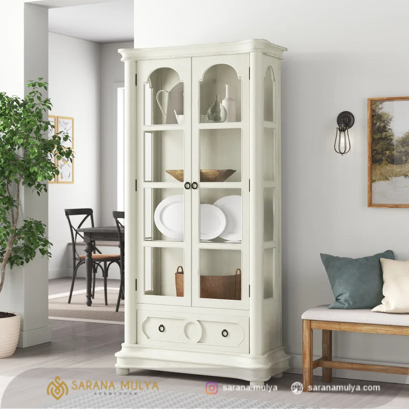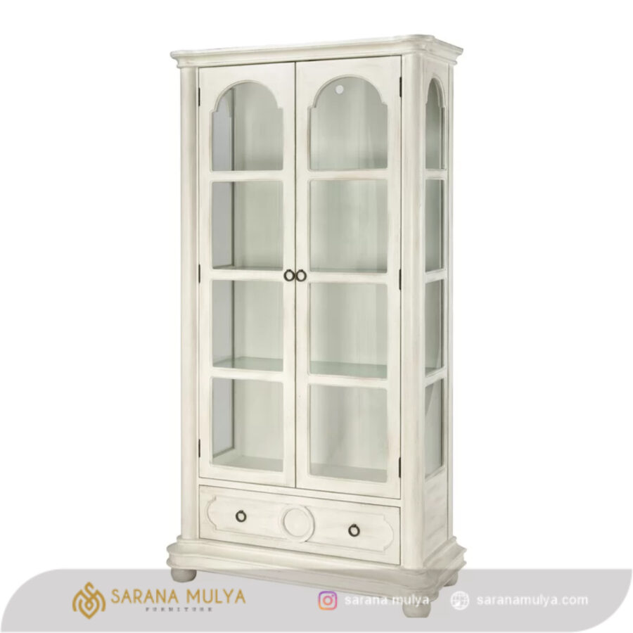 Untuk menyimpan aneka koleksi pajangan Anda agar tertata rapi, Lemari Hias Putih Minimalis Kayu persembahan dari saranamulya.com ini adalah pilihan yang tepat bagi Anda. Dengan desain minimalis modern, serta dilengkapi dengan laci penyimpanan, 4 tingkat rak dan pintu kaca yang memudahkan Anda untuk melihat isi di dalamnya. Lemari pajangan ini hadir dengan material kayu mahoni solid berkualitas dengan rancangan rangka yang kuat menjadikan Lemari hias ini dapat berdiri dengan stabil, kokoh dan tentunya tahan lama. Hasil akhir finishing semi glossy dengan warna putih yang akan menambah kemewahan di ruangan Anda. Lemari pajangan ini sangat cocok untuk Anda tempatkan di ruang tamu, ruang keluarga maupun kantor Anda.