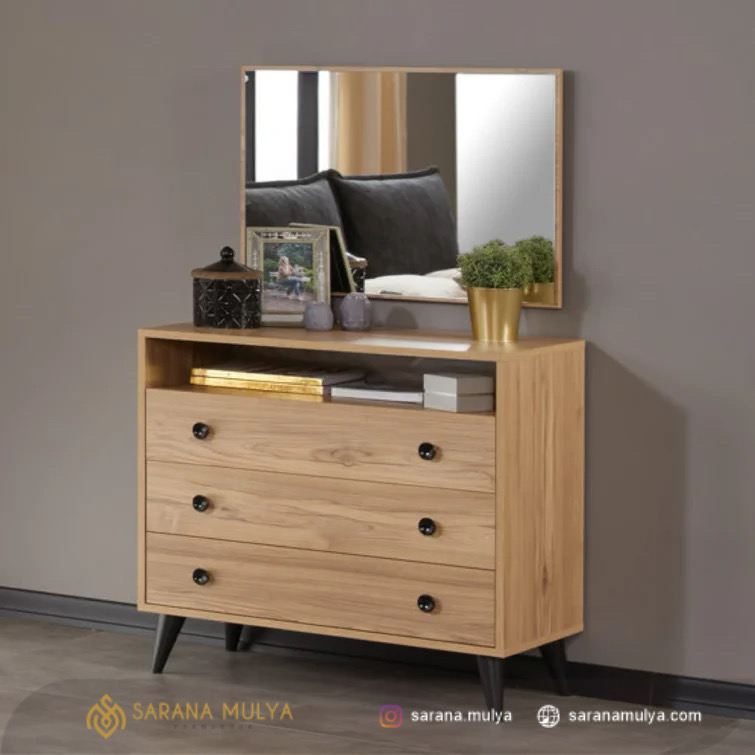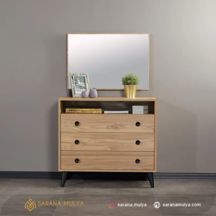 Padupadankan Lemari Laci Cermin Minimalis Kayu Jati ini dengan furnitur di Kamar Tidur yang selaras seperti Tempat Tidur, Meja Rias, Nakas maupun furnitur di Ruang Keluarga, dan itu semua bisa Anda dapatkan di saranamulya.com.