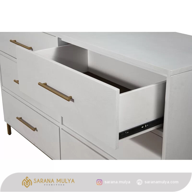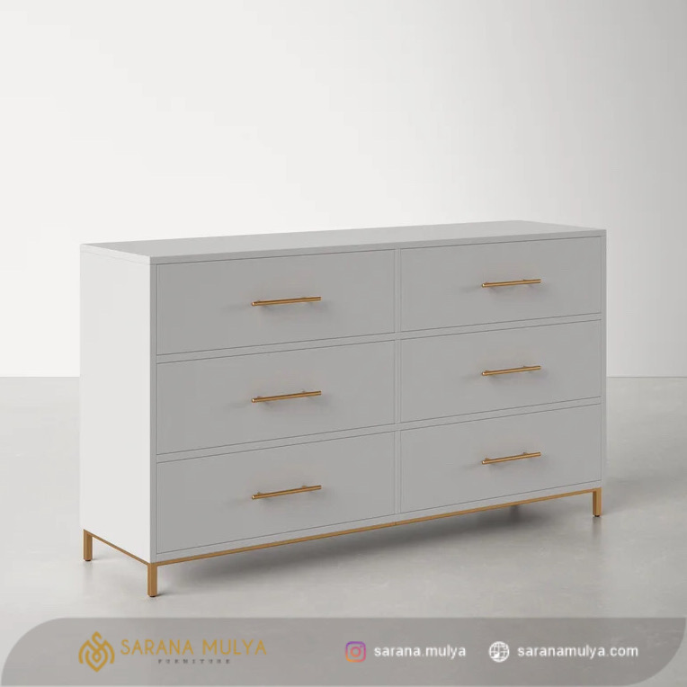 Lemari Laci Putih Minimalis Kaki Besi adalah solusi untuk membuat ruangan Anda tampak rapih dan teratur. Memiliki desain minimalis dan modern dengan tersedianya 6 laci yang bisa digunakan untuk menyimpan berbagai perkakas, aksesoris, atau baju. Lemari laci ini tidak hanya sebagai tempat penyimpanan tetapi juga bisa meningkatkan tampilan estetika atau sebagai tambahan dekorasi yang menarik. Terbuat dari material kayu mahoni kering berkualitas kombinasi kaki besi dan hasil akhir finishing semi glossy yang halus sehingga mudah untuk dibersihkan. Pengerjaannya yang presisi dan tingkat ketelitian yang baik membuat lemari laci ini kuat, kokoh dan tentunya tahan lama.