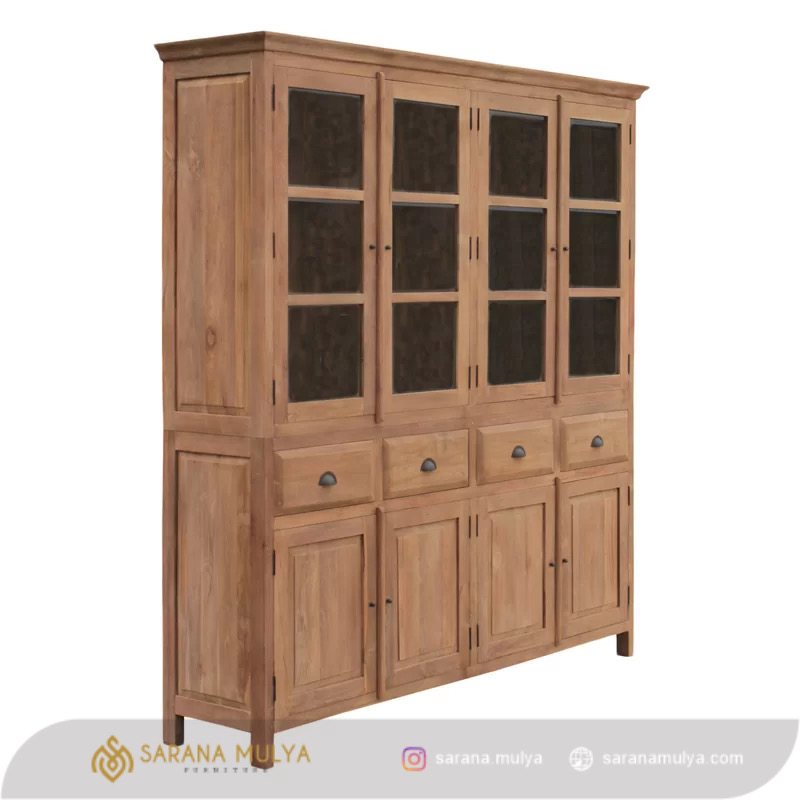 Lemari Pajangan Minimalis Kayu Jati 4 Pintu merupakan lemari multifungsi dengan desain minimalis yang akan menampilakan ornamen hias terbaik Anda dengan cantik. Menyediakan laci penyimpanan, 3 rak dengan 4 pintu kaca untuk tempat agar barang pajangan Anda tetap tersimpan dengan baik namun juga terpajang dengan cantik. Tidak hanya bisa untuk memajang hiasan, lemari pajangan ini juga bisa dimanfaatkan untuk menata rapi koleksi buku-buku kesayangan Anda. Penggunaan material kayu jati solid yang berkualitas dengan hasil akhir finishing semi glossy warna natural yang halus. Dirancan dengan rangka kuat yang menjadikan Lemari pajangan ini dapat berdiri dengan stabil, kokoh dan tentunya tahan lama. Cocok ditempatkan di ruang tamu, ruang keluarga maupun kantor Anda.