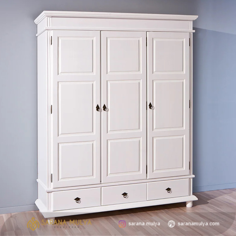 Tata rapi pakaian dan koleksi fashion Anda dengan Lemari Pakaian 3 Pintu Minimalis. Kehadiran lemari baju di kamar tidur adalah hal yang bisa terbilang wajib. Lemari pakaian 3 pintu ini dilengkapi dengan 3 laci di bagian bawah, kompartemen penyimpanan yang banyak serta tiang gantung untuk menggantung jaket, jas maupun long dress. Terbuat dari material kayu mahoni yang kokoh dan berkualitas dengan finishing duco warna putih. Selain itu, lemari baju ini hadir dengan desain modern minimalis yang cocok untuk semua tema ruangan Anda. Dapatkan segera produk ini dengan penawaran spesial dari saranamulya.com.