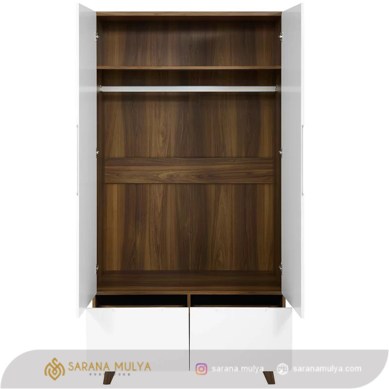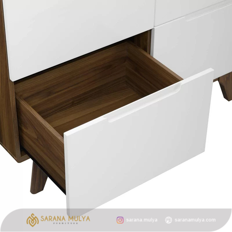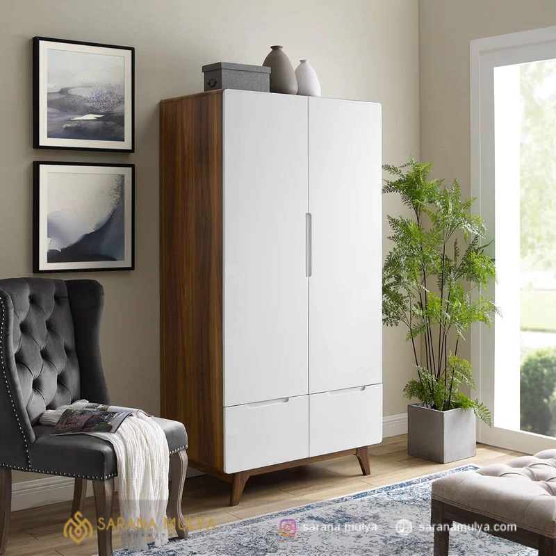 Lemari Pakaian Minimalis Retro Modern dapat di andalkan ketahanannya, terbuat dari material kayu mahoni kombinasi kayu jati berkualitas dengan konstruksi yang kokoh dengan hasil akhir finishing warna putihdan brown. Lemari baju ini siap melengkapi furnitur ruang tidur Anda. Produk lemari 2 pintu ini memiliki beberapa laci dan kompartemen di dalamnya sehingga dapat memudahkan Anda dalam menyimpan dan mengatur letak baju. Selain itu, Lemari Pakaian Minimalis Laci ini cocok di padankan dengan tipe furnitur lainnya, contohnya Padankan dengan tempat tidur yang berdesain minimalis.