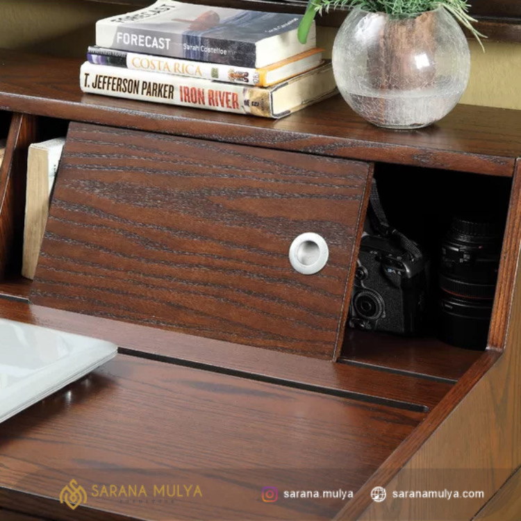 - Terdapat laci penyimpanan dan rak terbuka dengan berbagai bentuk dan ukuran