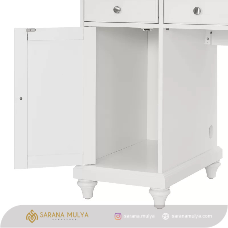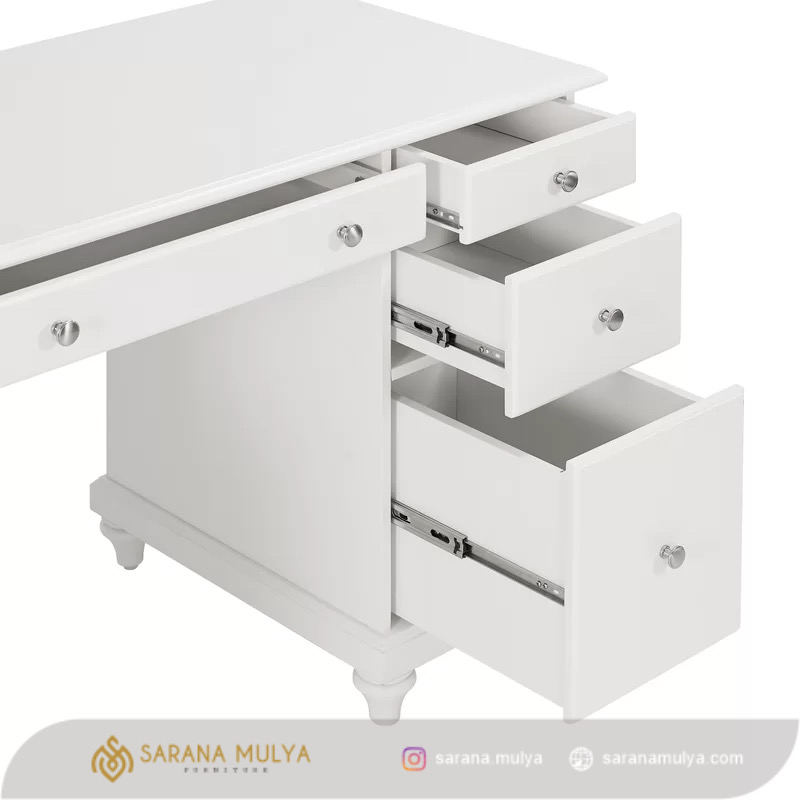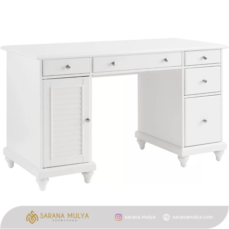 Perlengkapan untuk belajar anak bunda akan semakin tertata rapih dengan adanya Meja Belajar Minimalis Putih Shurau untuk menyimpan segala keperluannya. saranamulya.com menghadirkan meja belajar dengan desain minimalis modern yang akan membantu anak-anak bunda menjadikan area belajar serta beraktivitas yang nyaman dan mudah. Terbuat dari material kayu mahoni solid kering yang memiliki konstruksi kokoh dan berkualitas, dengan hasil akhir lapisan finishing yang halus dan warna putih. Meja belajar kayu ini terdapat 5 buah laci penyimpanan dengan bentuk dan ukuran yang berbeda dan 1 pintu swing yang luas untuk barang dan buku-buku si kecil.