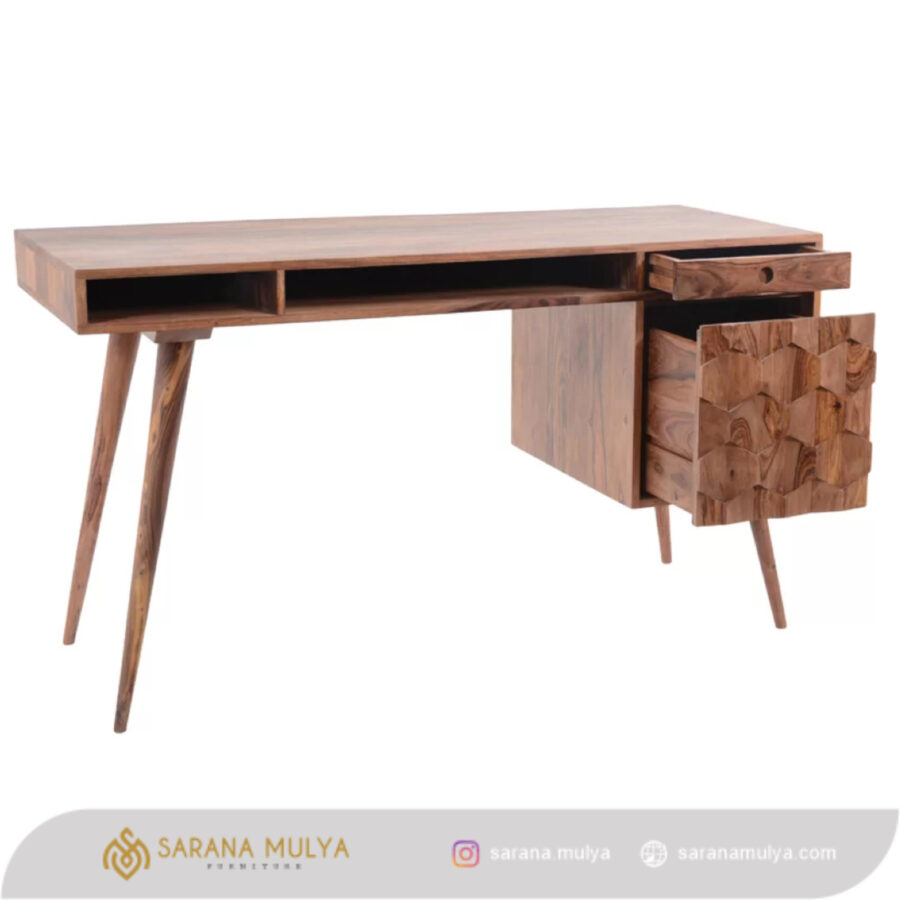 Meja Belajar Minimalis Unik Kayu Jati ini dapat bunda jadikan salah satu pilihan yang tepat untuk suasana belajar anak agar menjadi lebih nyaman. Dengan desain minimalis modern yang unik meja belajar anak ini memiliki ukuran yang pas sehingga lebih nyaman untuk si kecil ketika digunakan. Meja belajar kayu ini juga dilengkapi dengan laci penyimpanan pintu dan rak dengan berbagai bentuk dan ukuran untuk lebih memudahkan dalam menyimpan kebutuhan belajar anak bunda. Material meja belajar ini aman untuk si kecil, menggunakan material kayu jati solid dan finishing warna yang elegan dengan hasil akhir yang halus. Dengan menggunakan meja belajar yang tepat tentunya menjadikan si kecil lebih semangat belajar.