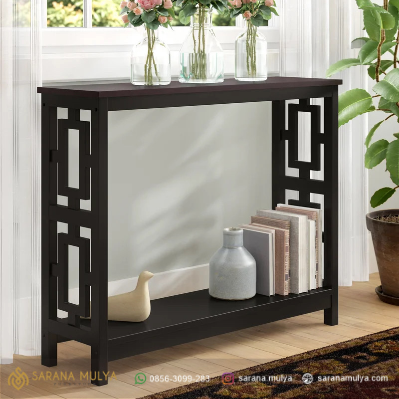 Meja Console Minimalis Modern Duco menampilkan Proporsi keaslian kayu mahoni solid dengan desain abat pertengahan yang di finishing halus warna hitam, untuk memberikan kesan modern minimalis dan klasik, Meja Konsol bisa menjadi tambahan yang indah di hampir semua ruangan, dari lorong ruang tamu hingga kamar tidur. Oleh karena itu, aksesori furniture ini menyediakan tempat untuk menampilkan barang barang dekoratif atau menyimpan barang barang yang harus mudah di akses.