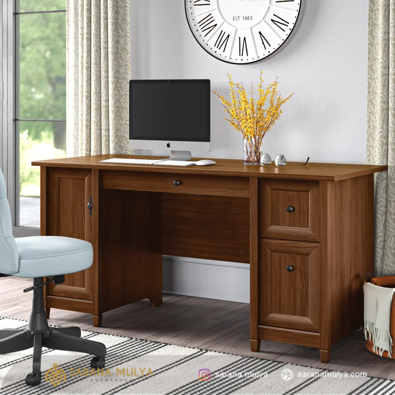 Menggunakan Meja Kantor Kayu Jati Minimalis Murah dalam bekerja tentu bisa membuat aktivitas lebih efektif dan efisien. Meja kerja ini dapat menjadi pilihan yang tepat untuk melengkapi ruang kerja di kantor. Meja ini memiliki pintu dan laci penyimpanan dengan berbagai bentuk dan ukuran untuk tempat perangkat komputer, menyimpan arsip atau kebutuhan kerja lainnya. Terbuat dari material kayu jati solid berkualitas dengan kontruksi yang kokoh, dan hasil akhir finishing yang halus sehingga mudah untuk dibersihkan. Furnitur kantor yang berkualitas mampu mendukung suasana kerja agar semakin efektif dan nyaman, untuk itu segera dapatkan produk ini dengan rangkaian penawaran spesial dari saranamulya.com