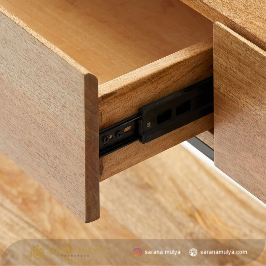 - Terdapat 2 laci penyimpanan dan rak terbuka.