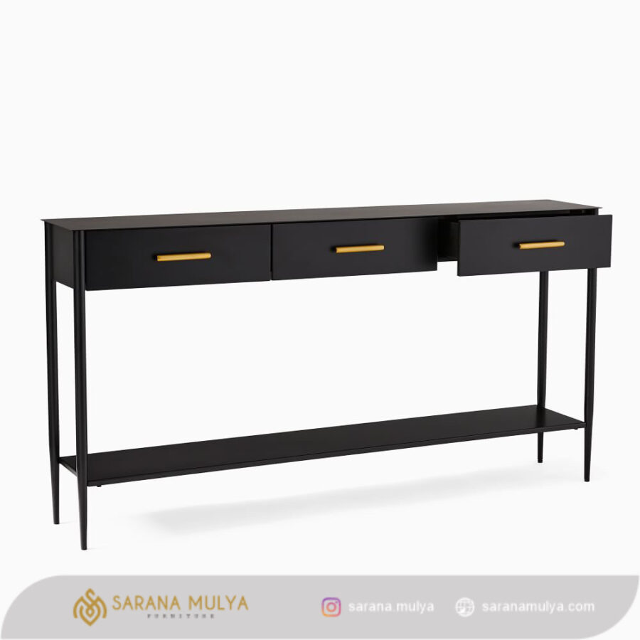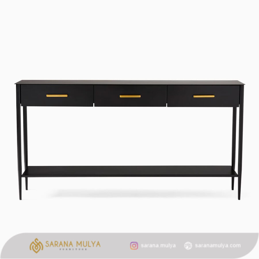 Hadirkan ruang penyimpanan tambahan dengan Meja Konsol Minimalis Laci Jati Solid. Ini adalah salah satu pilihan terbaik untuk menambah aksen dekorasi ruangan Anda. Selain itu, meja konsul ini juga memiliki desain menarik yang cocok digunakan pada ruangan bertema modern maupun minimalis. Terbuat dari material kayu jati solid berkualitas dengan finishing halus yang sempurna, menjadikannya kuat, kokoh dan juga awet untuk penggunaan jangka panjang. Meja konsol ini dilengkapi dengan tiga laci yang bisa Anda gunakan untuk menyimpan atau meletakkan bingkai foto, vas dan koleksi miniatur untuk mempercantik ruangan.