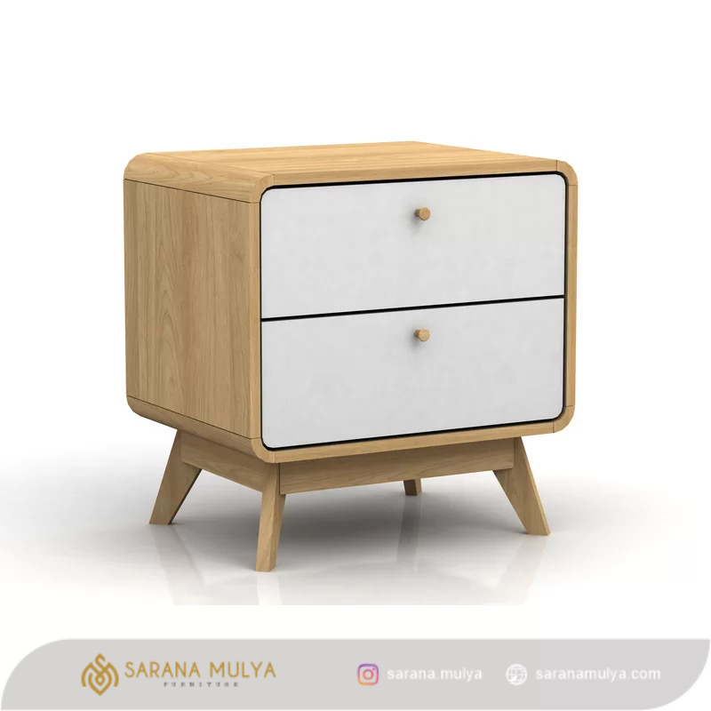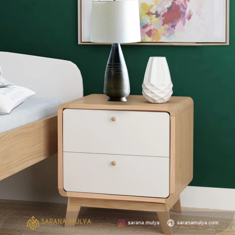 Meja Nakas Retro Kayu Kombinasi merupakan meja sisi tempat tidur yang berguna untuk menyimpan berbagai aksesoris dan barang berharga Anda. Dengan desain minimalis modern nakas kayu ini cocok untuk melengkapi kamar tidur Anda. Didukung dengan kaki kaki yang kuat serta 2 laci penyimpanan, Lalu, bagian atasnya dapat Anda gunakan untuk meletakkan pernak-pernik, jam weker maupun smartphone agar mudah dijangkau dari tempat tidur. Terbuat dari material kayu jati solid yang kuat dan kokoh kombinasi kayu mahoni dengan hasil akhir finishing warna yang cantik. Nakas ini akan menjadi furnitur pelengkap yang tepat dan fungsional untuk mempercantik kamar tidur kesayangan Anda.