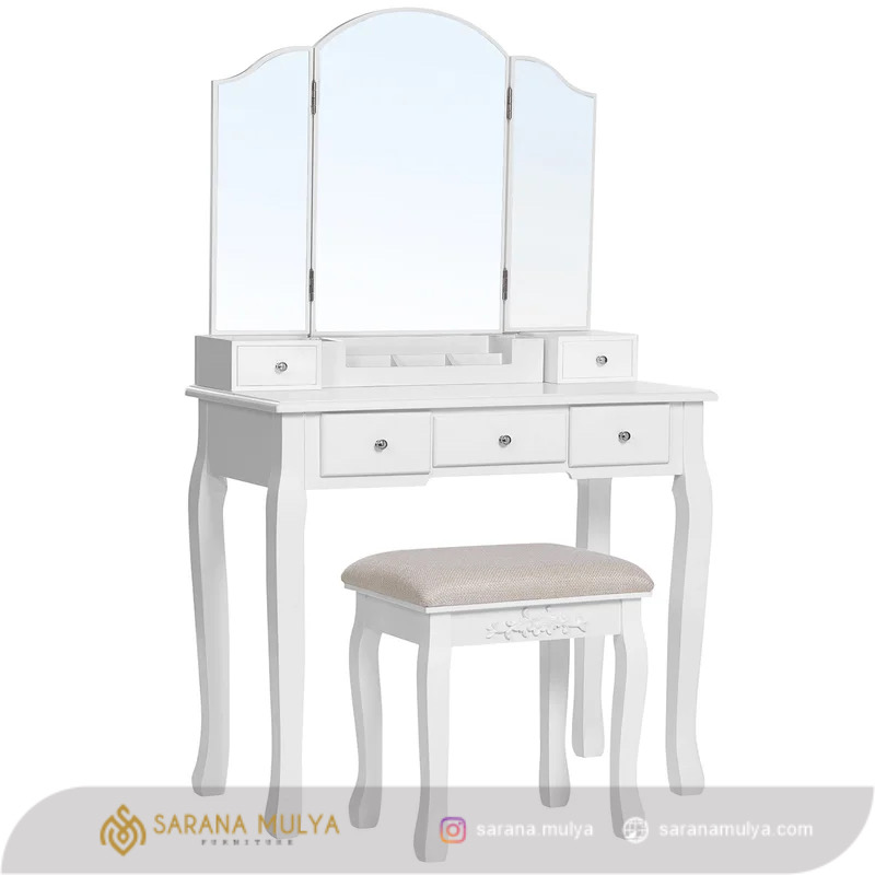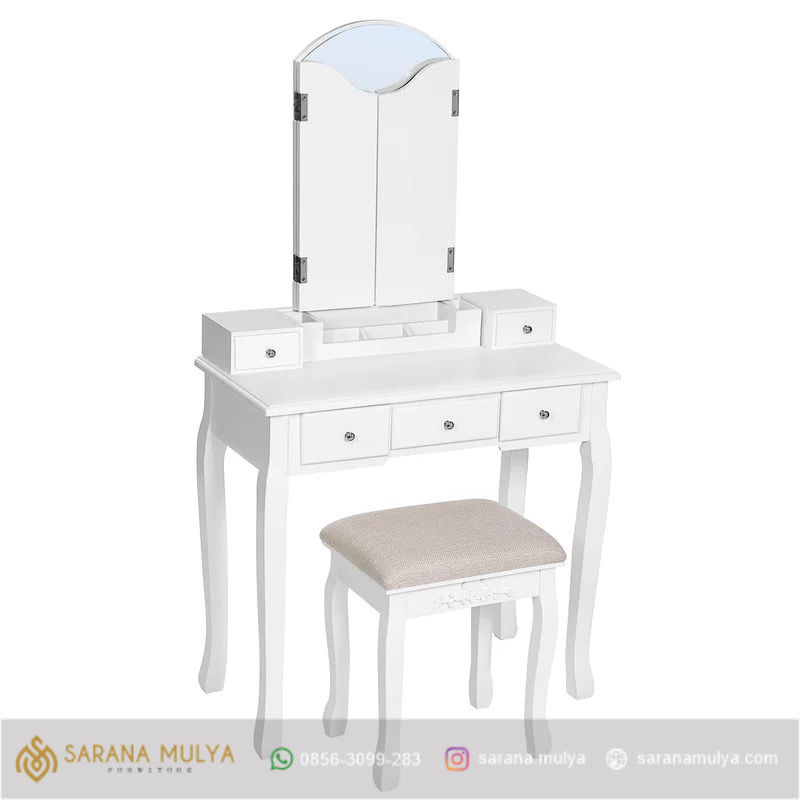 Hadirkan Meja Rias Cermin Lipat Minimalis di kamar tidur Anda sebagai salah satu pilihan dekorasi terbaik. Meja rias ini memiliki desain minimalis modern, sangat cocok untuk dikombinasikan dengan semua furnitur di kamar tidur anda. Terbuat dari material kayu mahoni solid kering berkualitas yang kuat dah kokoh dengan finishing duco warna putih. Meja rias kayu ini terdiri dari meja rias, kursi, dan cermin. Terdapat 5 laci penyimpanan pada meja rias yang difungsikan untuk tempat meletakkan pernak-pernik maupun alat makeup Anda. Selain itu, cermin meja rias ini pun bisa di lipat untuk menyesuaikan saat Anda berdandan.