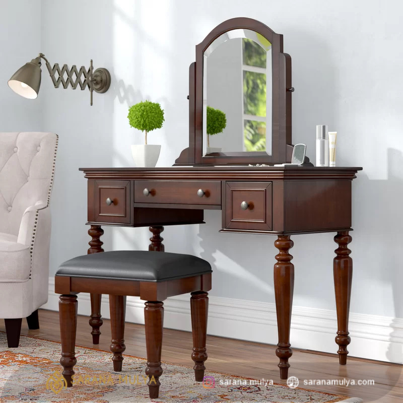 Meja Rias Jati Klasik Minimalis akan melengkapi furnitur kamar tidur Anda serta menjadinkan aktivitas berdandan Anda lebih nyaman. Desain minimalis modern bersama dengan set nya yang terdiri dari meja rias lengkap dengan cermin yang dapat di sesuaikan serta 1 buah kursi rias. Material meja rias ini terbuat dari kayu mahoni solid kering yang kokoh dengan finishing duco putih yang menambah tampilan mewah. Dengan memiliki 3 buah laci dan top meja yang luas dapat Anda manfaatkan untuk menimpan dan menyusun berbagai alat makeup atau pernak pernik lainnya sambil mempercantik diri.