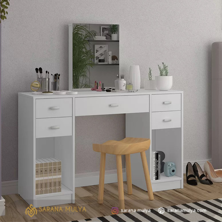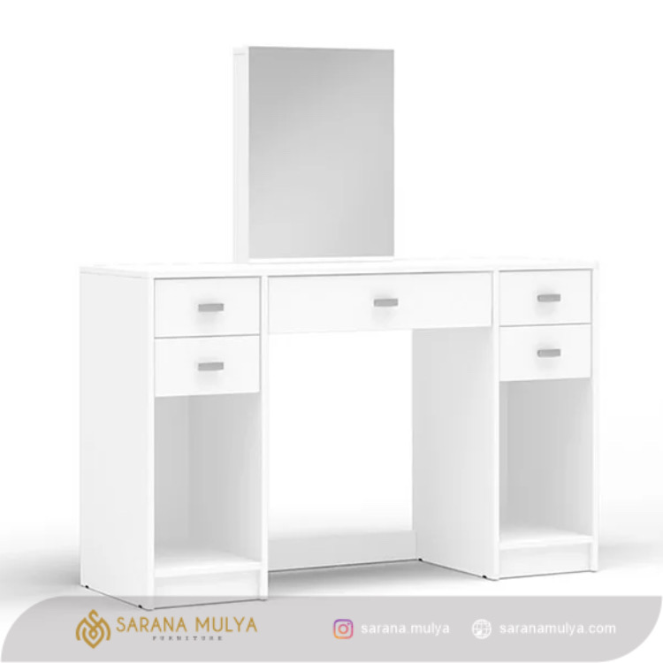 Lengkapi furnitur kamar tidur Anda serta menjadinkan aktivitas berdandan Anda lebih nyaman dengan Meja Rias Minamils Putih Terbaru. Memahami banyaknya alat-alat yang di perlukan saat Anda berias, meja rias kayu ini mampu menampung berbagai alat berias Anda agar tetap tertata rapi. Dengan desain minimalis modern meja rias ini terbuat dari material kayu mahoni solid kering yang dikenal kokoh dengan hasil akhir finishing warna putih yang mewah, juga di lengkapi dengan 5 laci penyimpanan dan rak terbuka yang memudahkan Anda untuk menyimpan pelengkap makeup, Meja Rias memiliki kapasitas yang luas dan mampu menampung beban yang cukup berat.