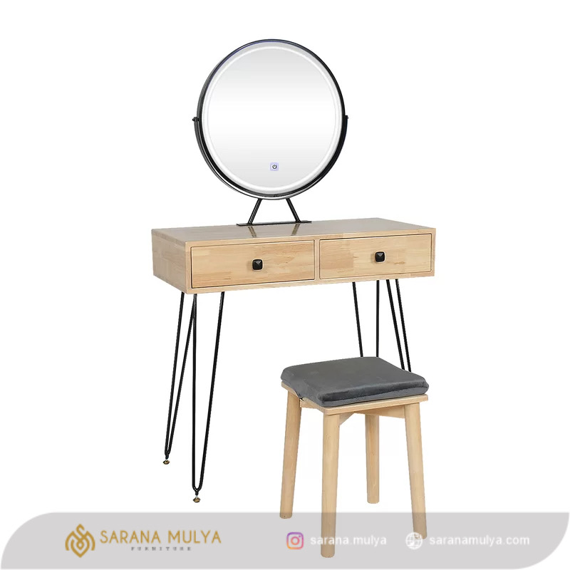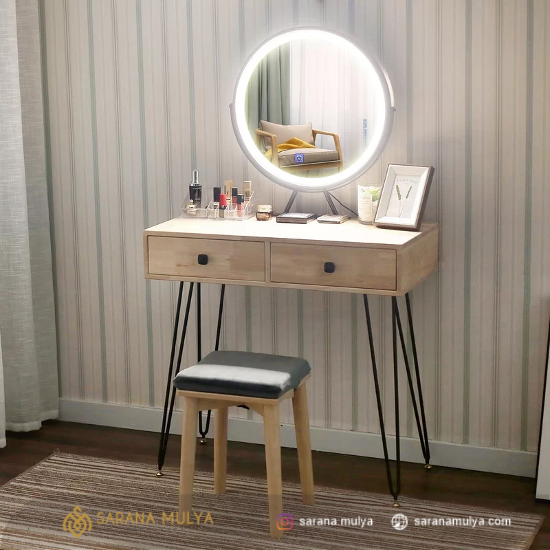 Hadirkan Meja Rias Minimalis Industrial Jati di kamar tidur Anda sebagai salah satu pilihan dekorasi terbaik. Meja rias ini memiliki desain industrial minimalis, sangat cocok untuk dikombinasikan dengan furnitur industrial di kamar tidur anda. Terbuat dari material kayu jati solid kombinasi besi berkualitas yang kuat dan kokoh. Meja rias kayu ini terdiri dari meja rias, kursi, dan cermin. Terdapat 2 laci penyimpanan pada meja rias yang difungsikan untuk tempat meletakkan pernak-pernik maupun alat makeup Anda. Selain itu, cermin meja rias ini pun memiliki lampu bisa untuk menyesuaikan keterangan saat Anda berdandan.
