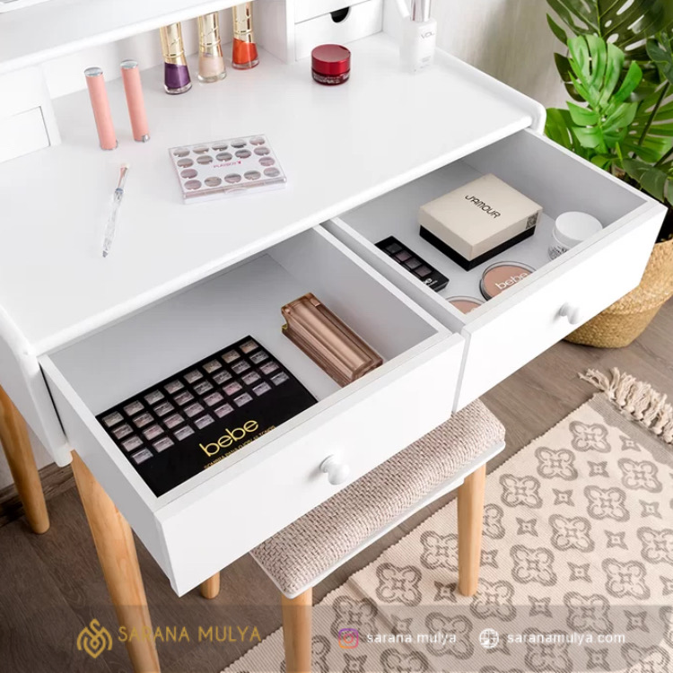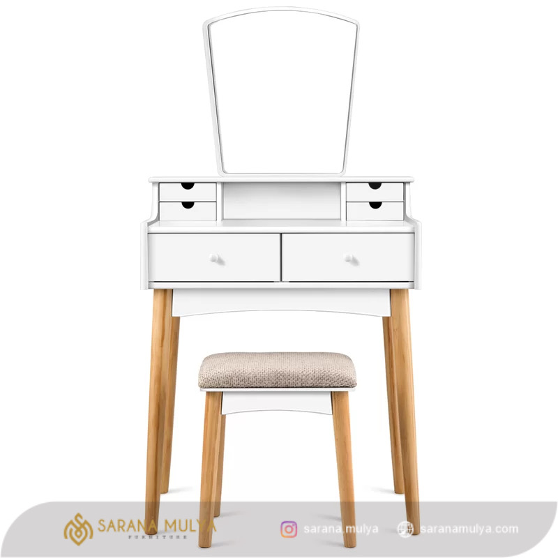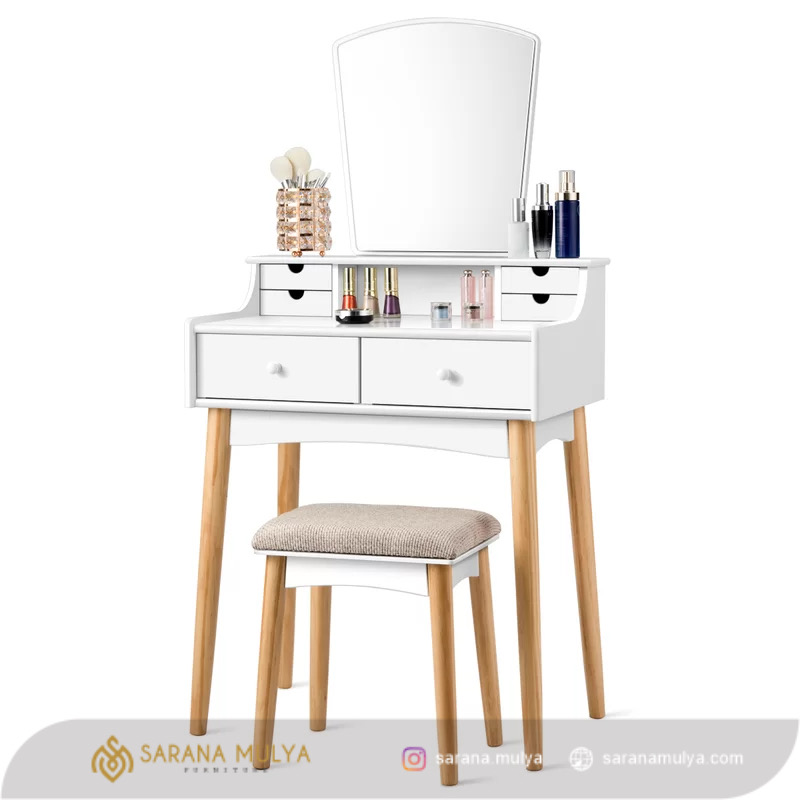 Meja RIas Minimalis Mini Kayu Kombinasi hadir untuk mengkapi furniture kamar tidur Anda agar terlihat lebih mewah. Desain minimalis modern dengan hasil akhir perpaduan warna putih dan natural yang elegan yang cocok untuk di kombinasikan dengan furniture lainya. Set ini terdiri dari meja rias lengkap dengan kursinya. Bahan Material menggunakan kayu mahoni solid kering kombinasi kayu jati yang kokoh dan tidak diragukan lagi keawetannya. Pada bagian top meja rias ini cukup luas untuk anda meletakkan peralatan makeup Anda, dan juga terdapat 6 buah laci sebagai tempat penyimpanan untuk tempat aksesoris dan lainnya.