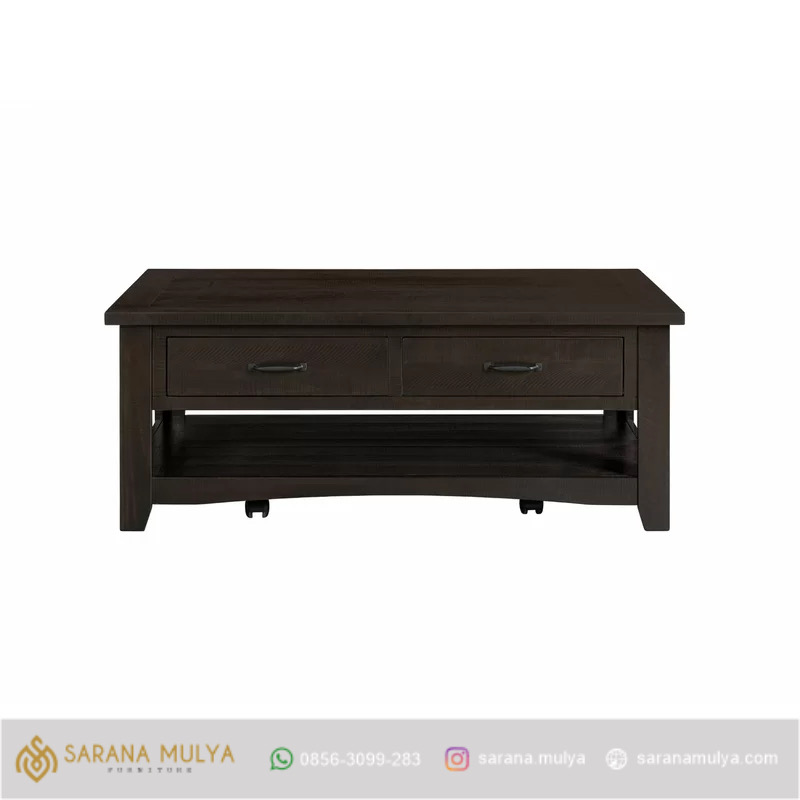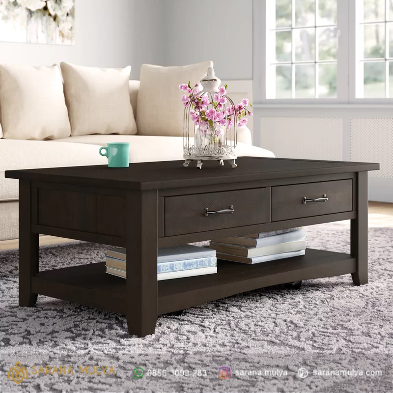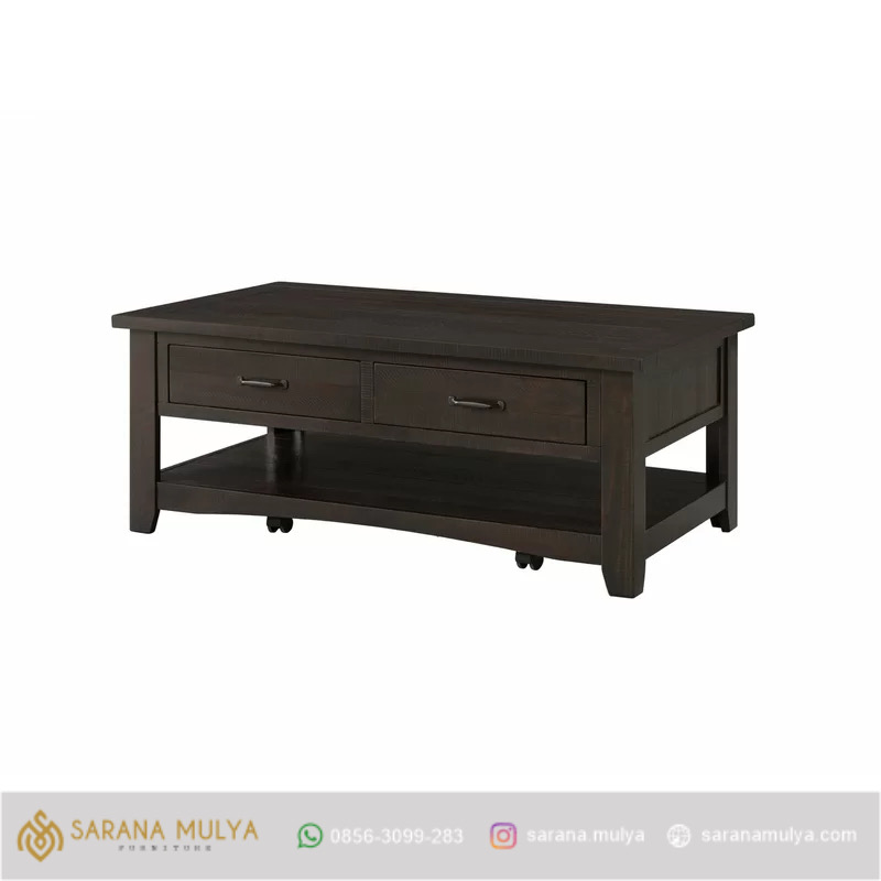 Meja Tamu Kayu 2 Laci Kualitas yang luar biasa, baik bahan yang digunakan maupun mesin yang digunakan, membuat produk ini lebih tahan lama. dengan desain minimalis dan modern akan mempercantik bila di kombinasikan dengan kursi sofa kesayangan Anda dan memberikan kesan hangat dan elegan, dengan material yang digunakan nya dari bahan kayu jati solid dan juga tidak mengandung bahan berbahaya. Meja bulat ini yang cocok di kombinasikan dengan dengan berbagai furniture di ruang tamu.