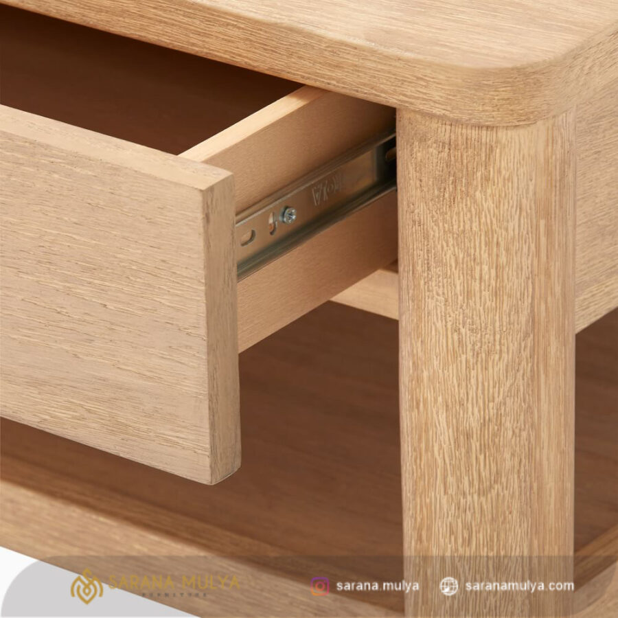 - Terdapat rak terbuka dan 2 laci penyimpanan