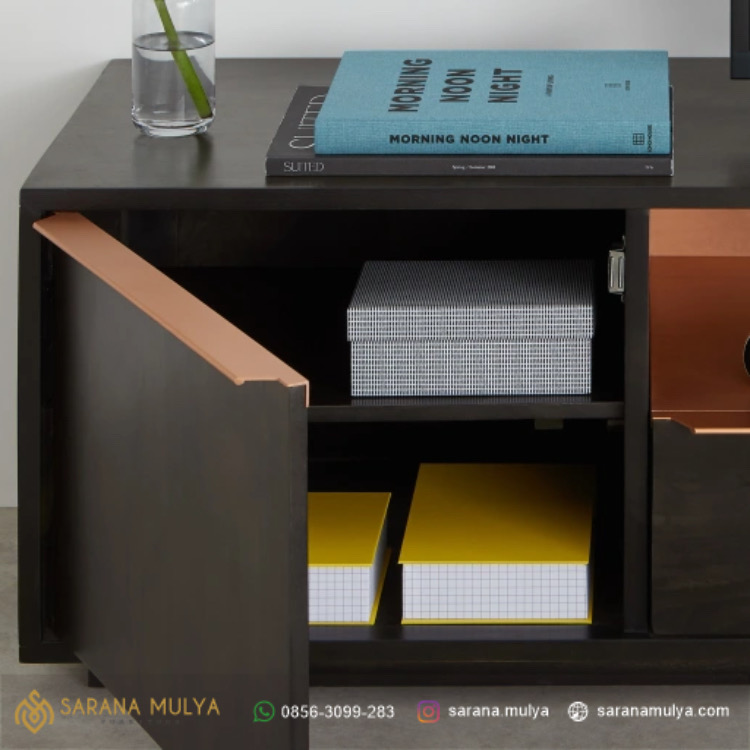 • Terdapat rak terbuka dengan lubang kabel, 1 pintu dan 1 pintu swing