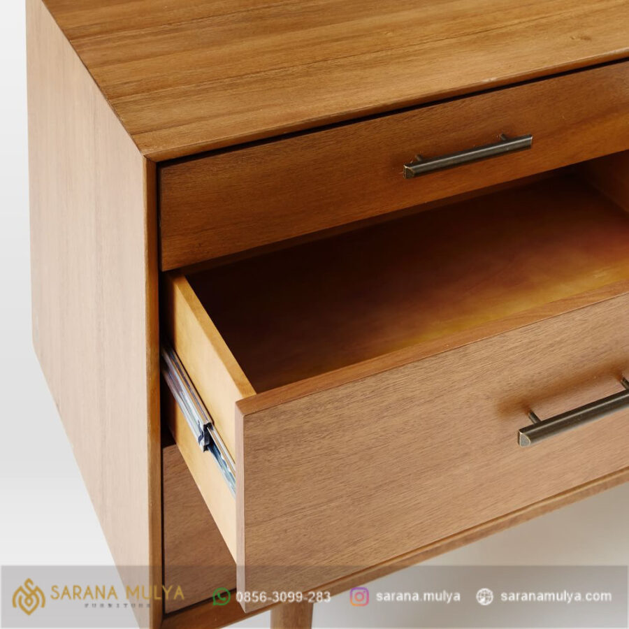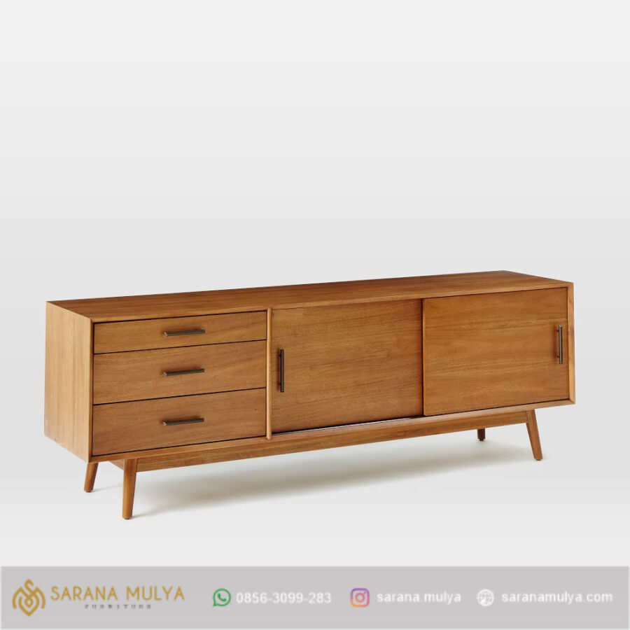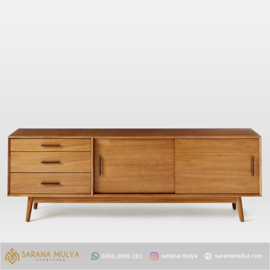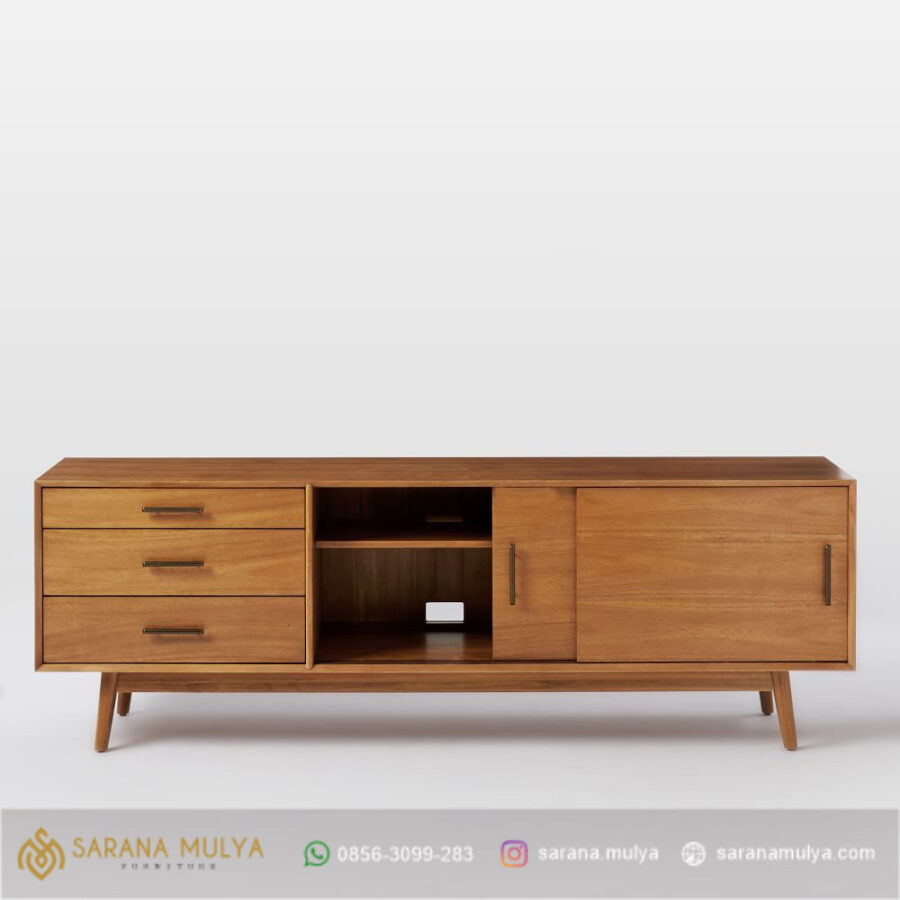 Meja Tv Klasik Modern Kayu Jati Berbahan kayu jati solid kering dengan finising semi glossy brown teak serta penyangga kaki yang ramping dapat menjamin kualitas produk ini yang tidak perlu diragukan lagi, Meja tv ini dilengkapi 3 laci dan 2 pintu sliding untuk penyimpanan barang-barang yang cukup luas. dengan desain yang unik, bernuansa minimalis mewah. Meja ini digunakan sebagai tempat TV, game konsol dan dvd player sekaligus menyimpan perlengkapan hiburan lainnya. Menikmati hiburan dari televisi bersama keluarga memang sangat nyaman dan menyenangkan. Tapi, akan lebih nyaman jika memiliki meja TV dengan ukuran yang sesuai dengan ruang tamu anda.