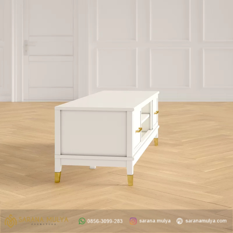 Meja Tv Minimalis Cat Duco Putih menampilkan material kayu mahoni solid dengan finishing duco warna putih. Sementara itu, produk meja tv ini memiliki tempat penyimpanan terbuka, dua pintu dan dua laci lengkap dengan lubang manajemen kabel, pilihan yang tepat untuk anda yang menyukai gaya minimalis di rumah kesayangan anda, produk ini bisa menjadi Sahabat terbaik untuk ruang tamu dan ruang hiburan anda, desain elegan akan menghiasi rumah Anda dengan sempurna.