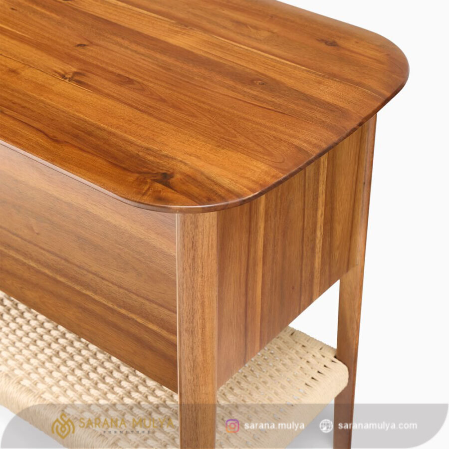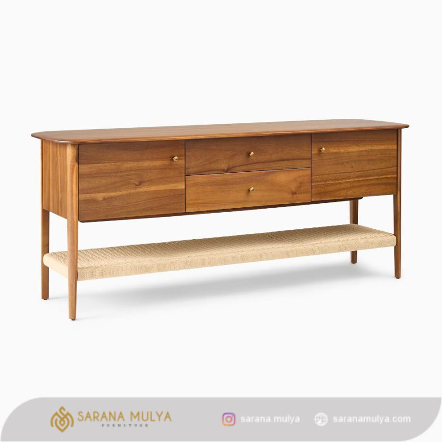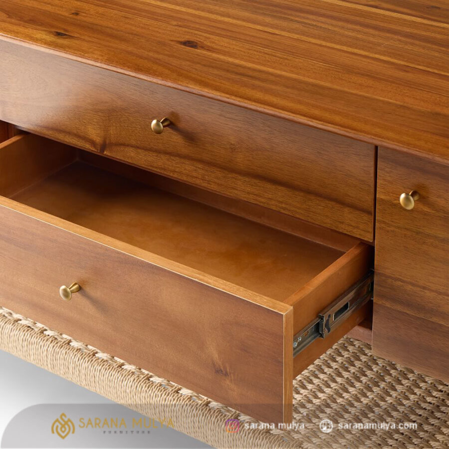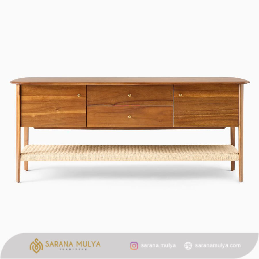Untuk meningkatkan dekorasi ruang keluarga hadirkan Meja Tv Minimalis Terbaru Kayu Jati ini agar terlihat lebih menarik dan modern. Dengan desain minimalis serta dibalut warna natural teak membuatnya cocok untuk berbagai tema dekorasi ruangan. Rak tv ini memiliki 2 pintu, 2 laci dan rak penyimpanan terbuka yang berguna untuk menyimpan atau meletakan DVD player, game konsol, remote, hingga buku. Terbuat dari material kayu jati solid kombinasi anyaman tali lum berkualitas sehingga menghasilkan konstruksi kuat dan kokoh untuk dapat menahan beban dengan baik.