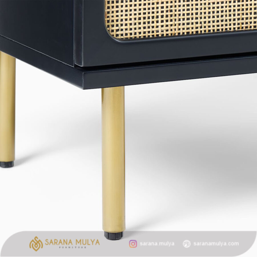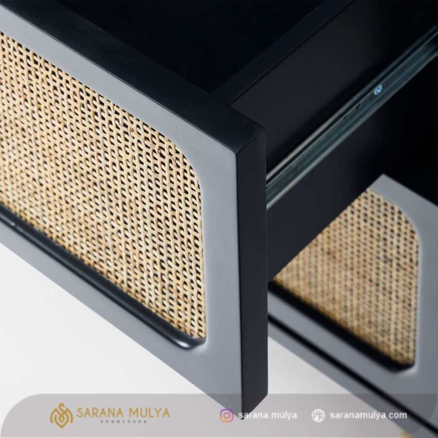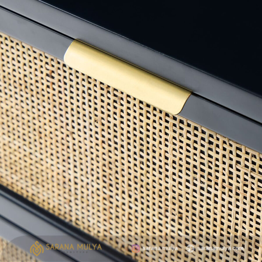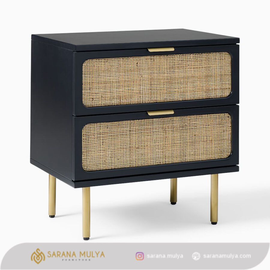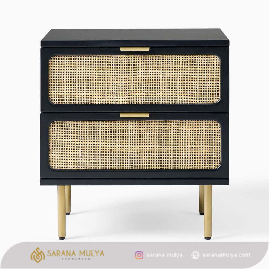 Nakas Rotan Kayu Hitam Minimalis memiliki fungsi sebagai tempat penyimpanan tambahan. Dengan desain minimalis elegan dan menawan yang cocok digunakan pada ruangan bergaya modern. Selain itu, meja nakas ini juga dilengkapi dengan 2 buah laci penyimpanan untuk menyimpan barang kesayangan Anda. Terbuat dari material kayu jati solid kombinasi anyaman rotan alami dan juga kaki besi berkualitas akan menjamin unit ini memiliki konstruksi yang kokoh serta awet untuk penggunaan jangka panjang. Segera lengkapi koleksi furnitur Anda dengan Nakas ini sekarang juga!