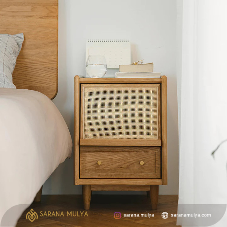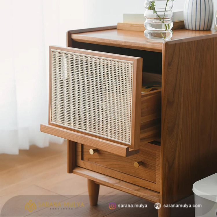 Nakas Rotan Terbaru Jati Solid Minimalis menyempurnakan tampilan kamar tidur Anda. Hadir dengan desain minimalis dan juga modern yang akan menambah nilai estetika di hunian Anda. Selain itu, meja nakas ini juga dilengkapi 2 laci penyimpanan untuk menyimpan barang berharga Anda seperti ponsel, dompet, maupun buku. Terbuat dari material kayu jati solid berkualitas kombinasi rotan alami dengan konstruksi kokoh dan juga kuat serta awet untuk penggunaan jangka panjang. Sangat cocok diletakkan di samping tempat tidur maupun di samping sofa dengan lampu meja dan juga dekorasi tambahan di atasnya.