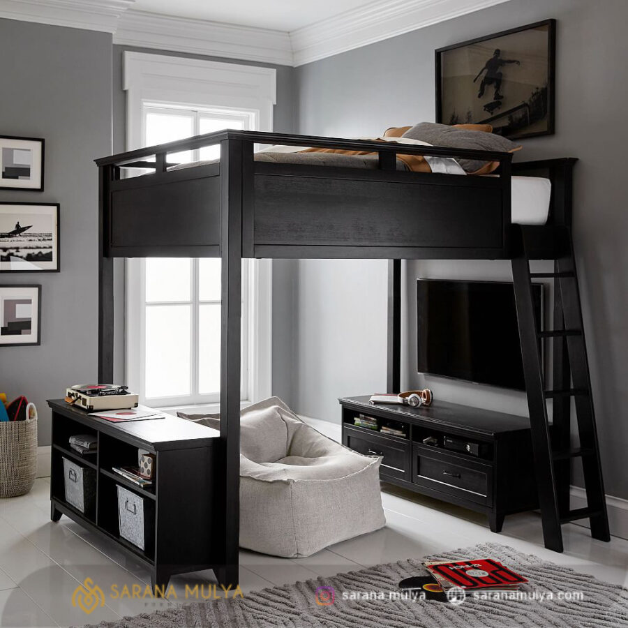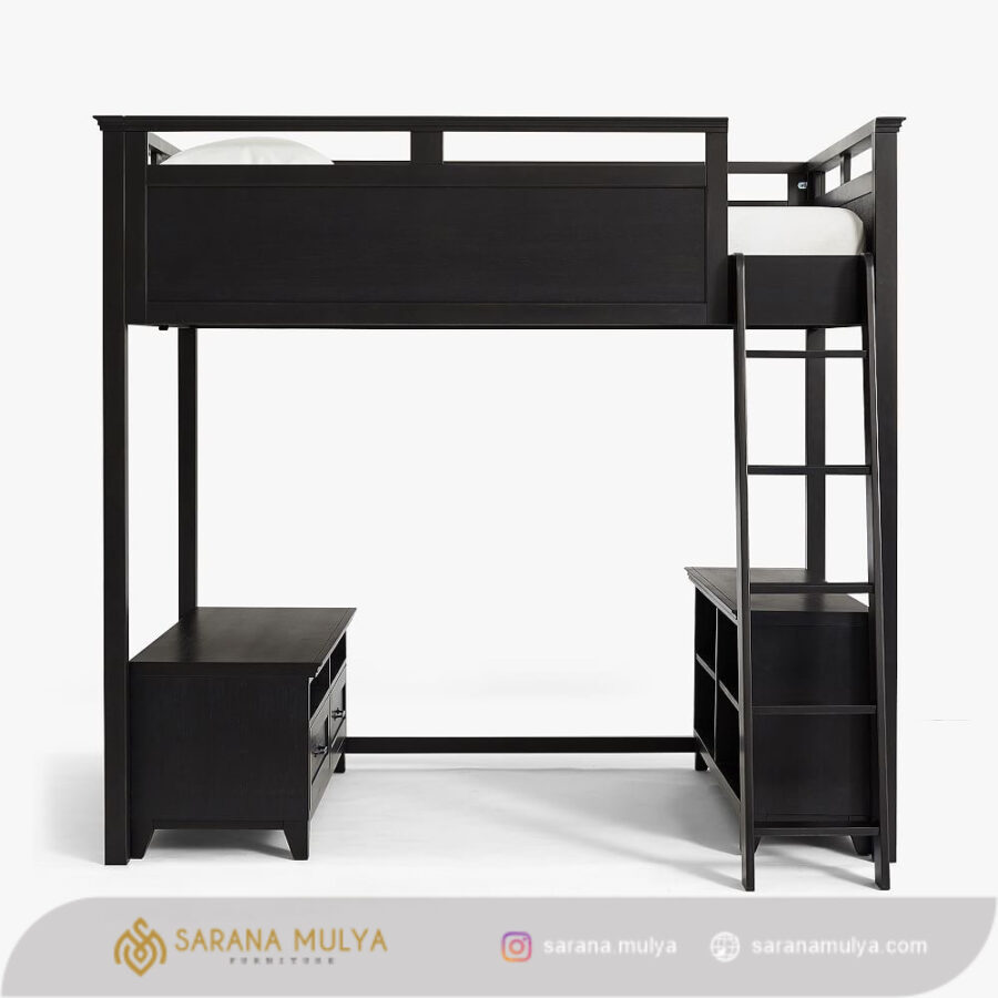 Buat waktu tidur anak bunda lebih nyaman dengan Ranjang Tingkat Kayu Jati Minimalis. Ini merupakan salah satu solusi ideal untuk hunian minimalis. Terdiri dari 1 tempat tidur tingkat dan sebuah tangga sehingga mampu menghemat penggunaan ruangan. Terdapat juga laci dan rak terbuka serbaguna untuk tempat penyimpanan si kecil. Ranjang Tingkat Kayu Jati Minimalis ini terbuat dari material kayu jati solid kering sehingga kuat dan kokoh, dengan hasil akhir finising semi glossy warna hitam yang halus dan tentunya tahan lama. Cocok untuk penggunaan di apartemen, asrama atau ruangan yang tidak terlalu besar. Dapatkan segala kebutuhan furnitur anak hanya di saranamulya.com