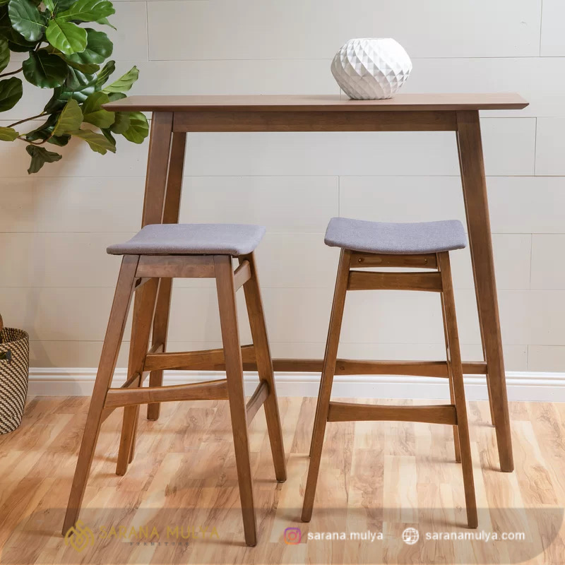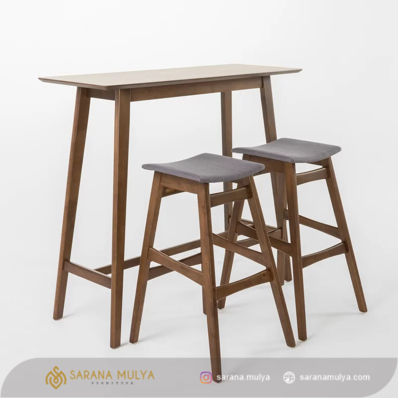 Set 2 Kursi Bar Minimalis Simple ini dapat dihadirkan untuk melengkapi interior tempat usaha seperti kafe, restoran maupun hotel berkonsep modern. Set meja bar ini Terdiri dari 1 meja bar dan 2 buah kursi bar. Penggunaan bahan material kayu jati solid berkualitas yang akan menjamin daya tahan set meja bar ini bisa di gunakan dalam jangka waktu yang lama. Memiliki desain ergonomis dengan pijakan pada bagian kaki kursinya untuk menopang kaki agar lebih nyaman. Selain dapat dihadirkan untuk melengkapi interior tempat usaha, meja ini juga cocok untuk keperluan ruang makan di rumah.