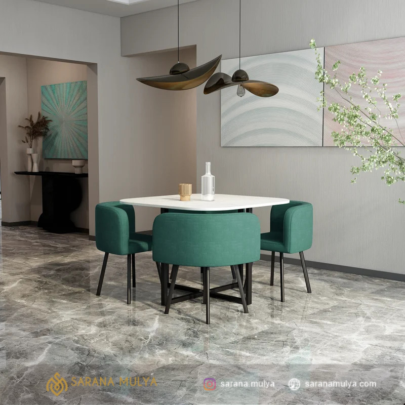 Set Kursi Cafe Fabric Top Marmer Minimalis untuk kenyamanan dan bisa menjadi inspirasi menarik untuk ruang makan maupun kebutuhan interior kafe, restoran atau hotel. Set kursi cafe bergaya minimalis modern ini terdiri dari 1 meja makan dan 4 buah kursi. Untuk Meja terbuat dari material besi kombinasi top marmer, sementara kursi nya terbuat dari material kayu jati dilengkapi dengan busa berlapis kain fabric pada dudukan dan sandarannya. Semua material berkualitas, dengan struktur yang kuat, kokoh dan tentunya lebih tahan lama. Sangat cocok untuk mengisi ruang makan di rumah, kafe, restoran atau hotel.