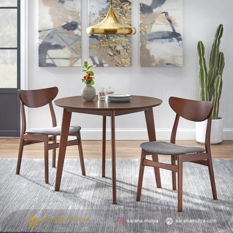 Set Kursi Cafe Ropan Kayu Jati Minimalis untuk kenyamanan dan bisa menjadi inspirasi menarik untuk ruang makan maupun kebutuhan interior kafe, restoran maupun hotel. Set kursi cafe bergaya minimalis modern ini terdiri dari 1 meja makan dan 2 buah kursi. Untuk Meja memiliki desain bulat yang terbuat dari material kayu jati solid, sementara kursi nya terbuat dari material kayu jati dilengkapi dengan busa berlapis kain fabric pada dudukannya. Semua material berkualitas, dengan struktur yang kuat, kokoh dan tentunya lebih tahan lama. Sangat cocok untuk mengisi ruang makan di rumah, kafe, restoran atau hotel.