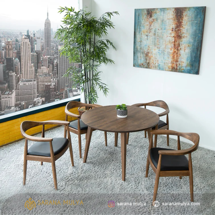 Lengkapi furnitur ruang makan Anda dengan Set Meja Makan Bulat Minimalis Swire. Meja makan ini dilengkapi dengan 4 buah kursi, terbuat dari material kayu jati solid berkualitas dengan rangka yang kokoh sehingga dapat digunakan dalam jangka waktu yang pajang. Terdapat bantalan pada dudukan kursi makan yang akan memberikan rasa nyaman yang sempurna. Hadir dengan desain natural dan minimalis pada interior ruangan. Set meja makan kayu ini adalah pilihan yang tepat untuk menemani waktu bersantap Anda bersama keluarga setiap hari.
