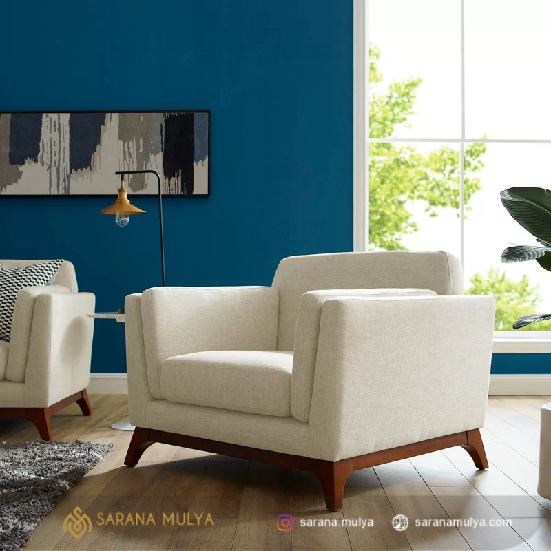 Hadirkan suasana di ruang tamu maupun ruang keluarga Anda lebih nyaman dengan sentuhan Sofa Single Minimalis Murah Duxey. Sofa 1 dudukan ini hadir dengan gaya minimalis modern dan warna cream yang membuat tampilan ruangan Anda lebih bergaya. Material jok di buat dari busa empuk dengan lapisan kain fabric yang memberikan kesan eksklusif pada dekorasi ruangan. Selain itu, struktur konstruksi rangka pada sofa single ini terbuat dari kayu jati solid berkualitas yang kokoh dan stabil. Pengerjaannya yang presisi membuat sofa tidak mudah goyang dan terasa nyaman ketika digunakan.