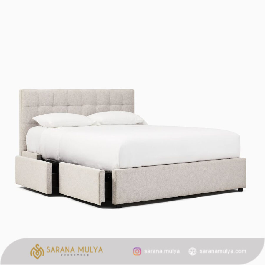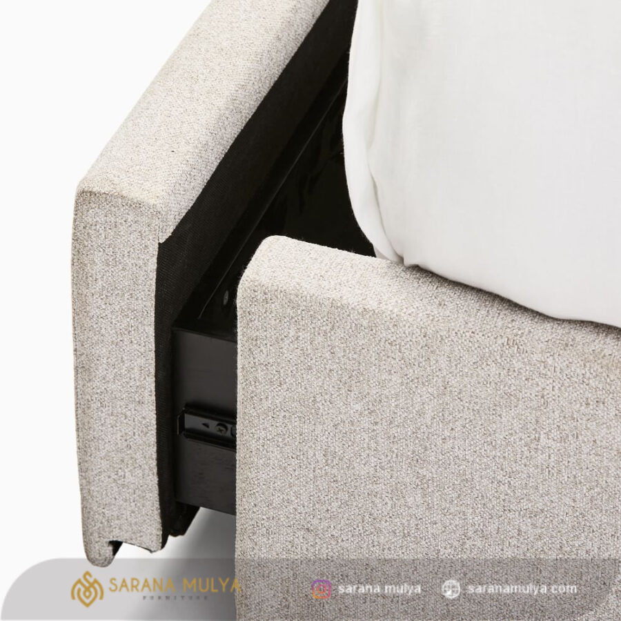 Sempurnakan interior kamar tidur Anda dengan Tempat Tidur Laci Samping Heyna ini. Hadir dengan sentuhan desain minimalis dan modern, terdapat laci dibagian samping yang bisa Anda manfaatkan untuk menyimpan barang-barang kesayangan Anda, tempat tidur yang sempurna ini juga dapat meningkatkan tampilan dekorasi kamar tidur Anda. Terbuat dari material kayu jati solid berkualitas dengan berlapis busa dan kain fabric, yang akan menjamin kualitas produk yang kokoh serta awet untuk penggunaan jangka panjang. Anda bisa menggunakannya untuk kasur yang berukuran 180 x 200 cm atau juga bisa Ada custom kepada kami.
