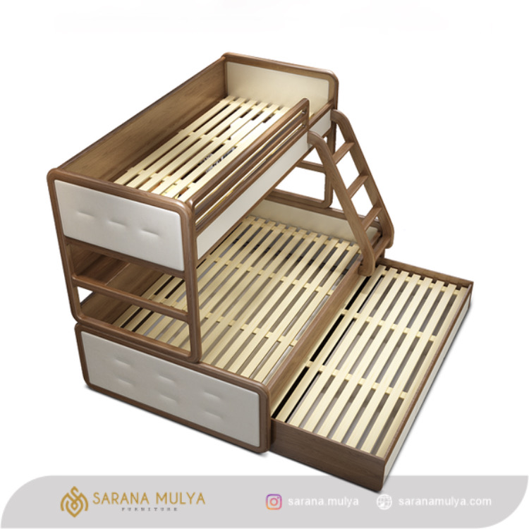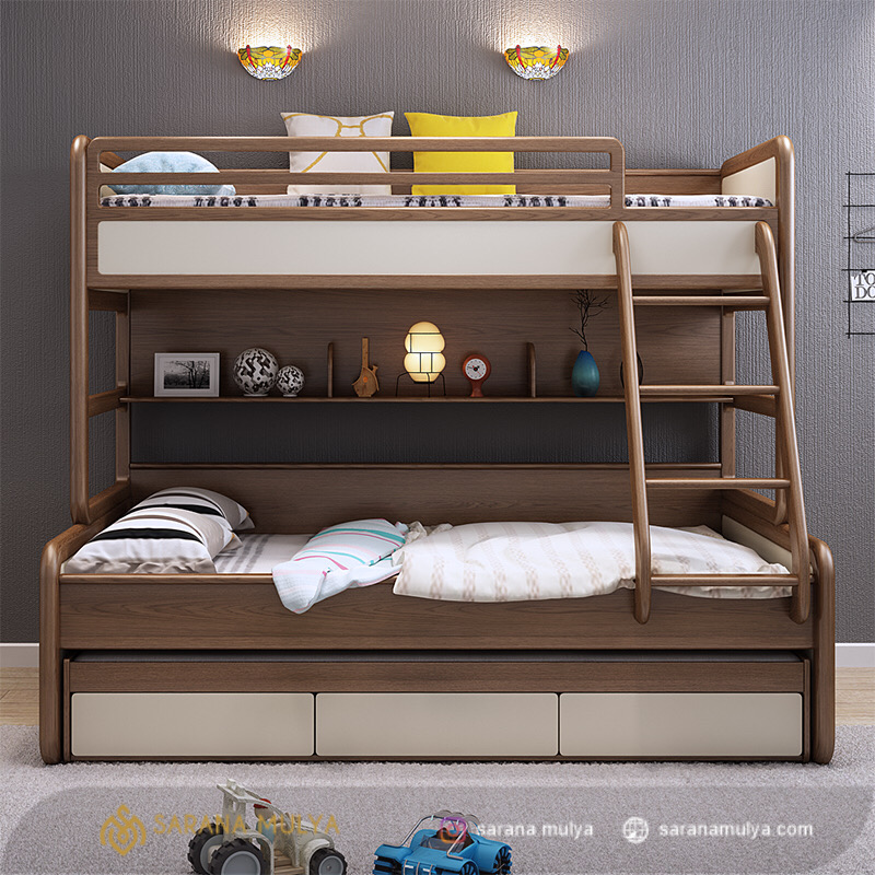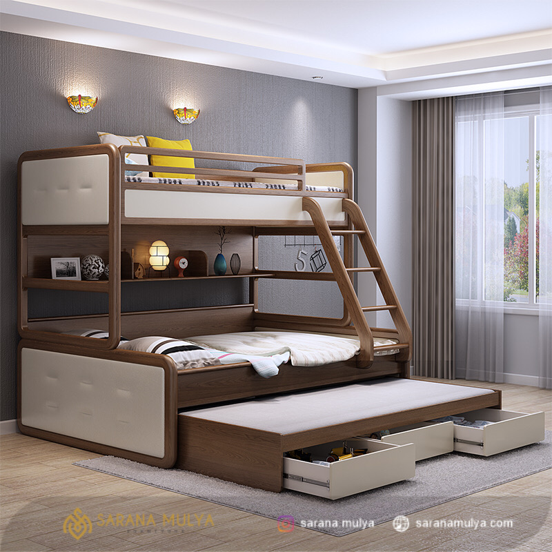 • Terdapat laci penyimpanan rak terbuka dan sorong paling bawah untuk kasur ketiga