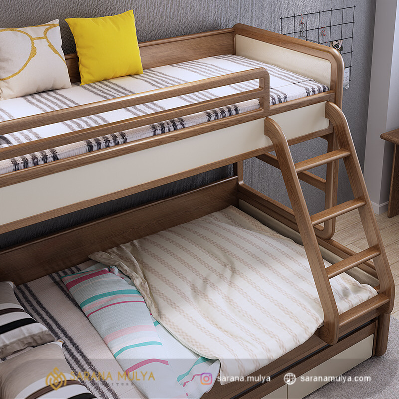Buat waktu tidur anak bunda lebih nyaman dengan Tempat Tidur Tingkat Masakini Kayu Jati. Ini merupakan salah satu solusi ideal untuk hunian minimalis. Terdiri dari 2 tempat tidur tingkat dan sebuah tangga sehingga mampu menghemat penggunaan ruangan. Terdapat juga laci dan meja rias serbaguna untuk tempat penyimpanan si kecil. Tempat Tidur Tingkat Masakini Kayu Jati ini terbuat dari material kayu jati solid kering sehingga kuat dan kokoh, dengan hasil akhir finising semi glossy warna kombinasi yang halus dan tentunya tahan lama. Cocok untuk penggunaan di apartemen, asrama atau ruangan yang tidak terlalu besar. Dapatkan segala kebutuhan furnitur anak hanya di saranamulya.com