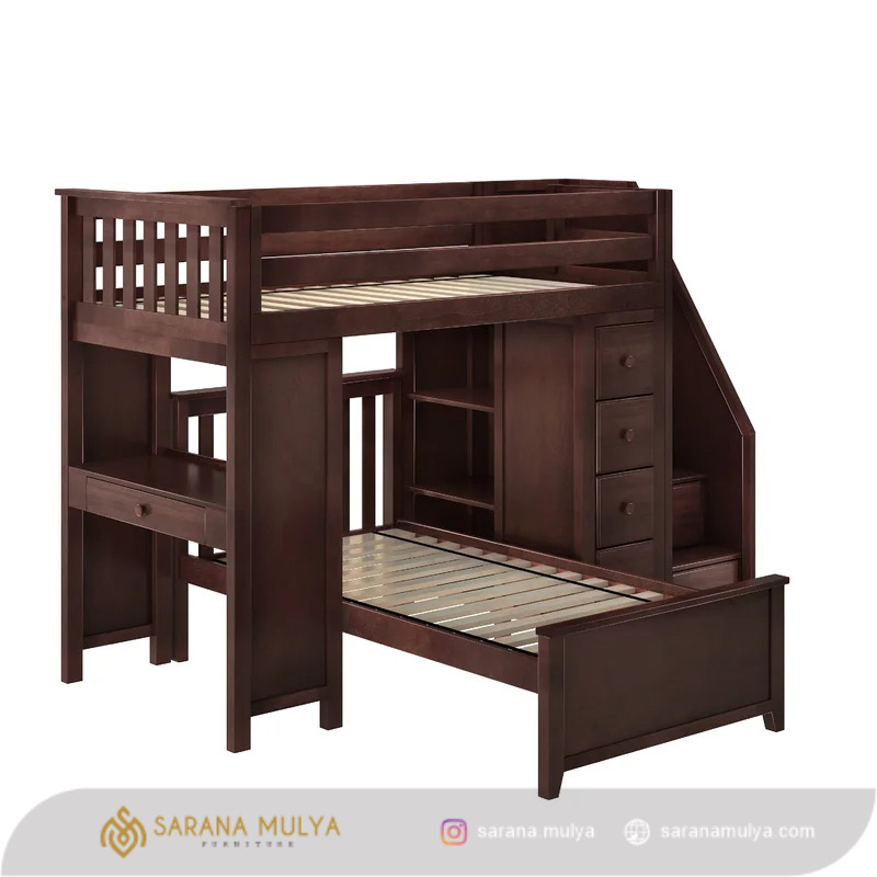 Tempat Tidur Tingkat Multifungsi Kayu Jati merupakan solusi kebutuhan kamar tidur untuk hunian minimalis, ataupun hunian yang tidak memiliki banyak kamar. Terdiri dari 2 tingkat tempat tidur dengan laci penyimpanan dan meja untuk belajar anak Bunda sehingga mampu menghemat penggunaan tempat. Tempat Tidur Tingkat Multifungsi Kayu Jati ini terbuat dari material kayu Kayu solid kering sehingga kokoh dan tahan lama tentunya. Desainnya sendiri, selain mampu menghemat ruangan pada kamar tidur juga dibuat stabil agar nyaman saat digunakan untuk anak Bunda. Cocok sekali untuk penggunaan di apartemen maupun asrama.